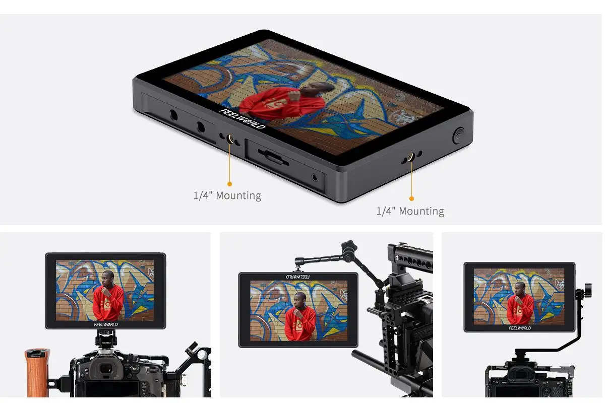 The monitor is equipped with 2 standard 1/4”mounting threads (bottom, right side), you can easily mount it on the camera or other types of equipment with a magic arm, bracket, etc.. Meet the different monitoring for photographer or director.