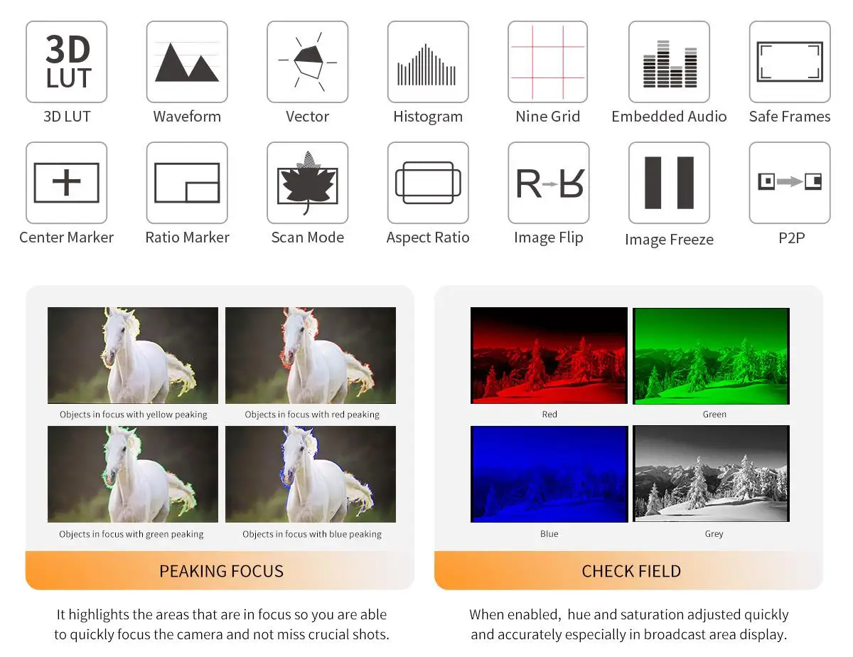 Supports HDR (high dynamic range) monitoring, for incredible clarity and detail, simplifies the complexities of shooting Log and HDR, helping you to replicate post-production workflows at the moment when it matters most–while shooting. When the HDR function is turned on, you can select Gamma and Gamut corresponding to the camera Sony, Canon, Panasonic, Fujifilm, Bolex, RED, ARRI.