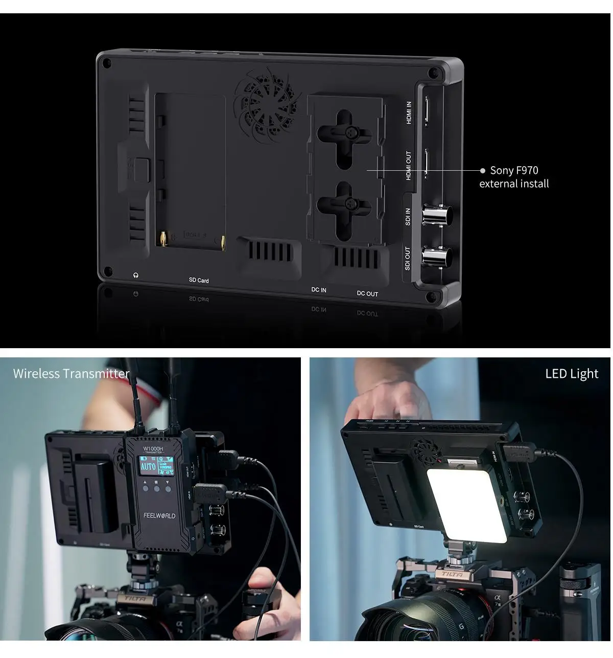 A Sony F970 external install and power kit design is added to the back of the monitor. The external kit can be used to install and install the external equipment, like wireless transmission, LED light, video converter and others that can be powered by a Sony F970 battery. This innovative external power supply design meets the need to power for external wireless transmission, LED light and other equipment, greatly saving the space occupied by the equipment and reducing the weight of photography equipment.