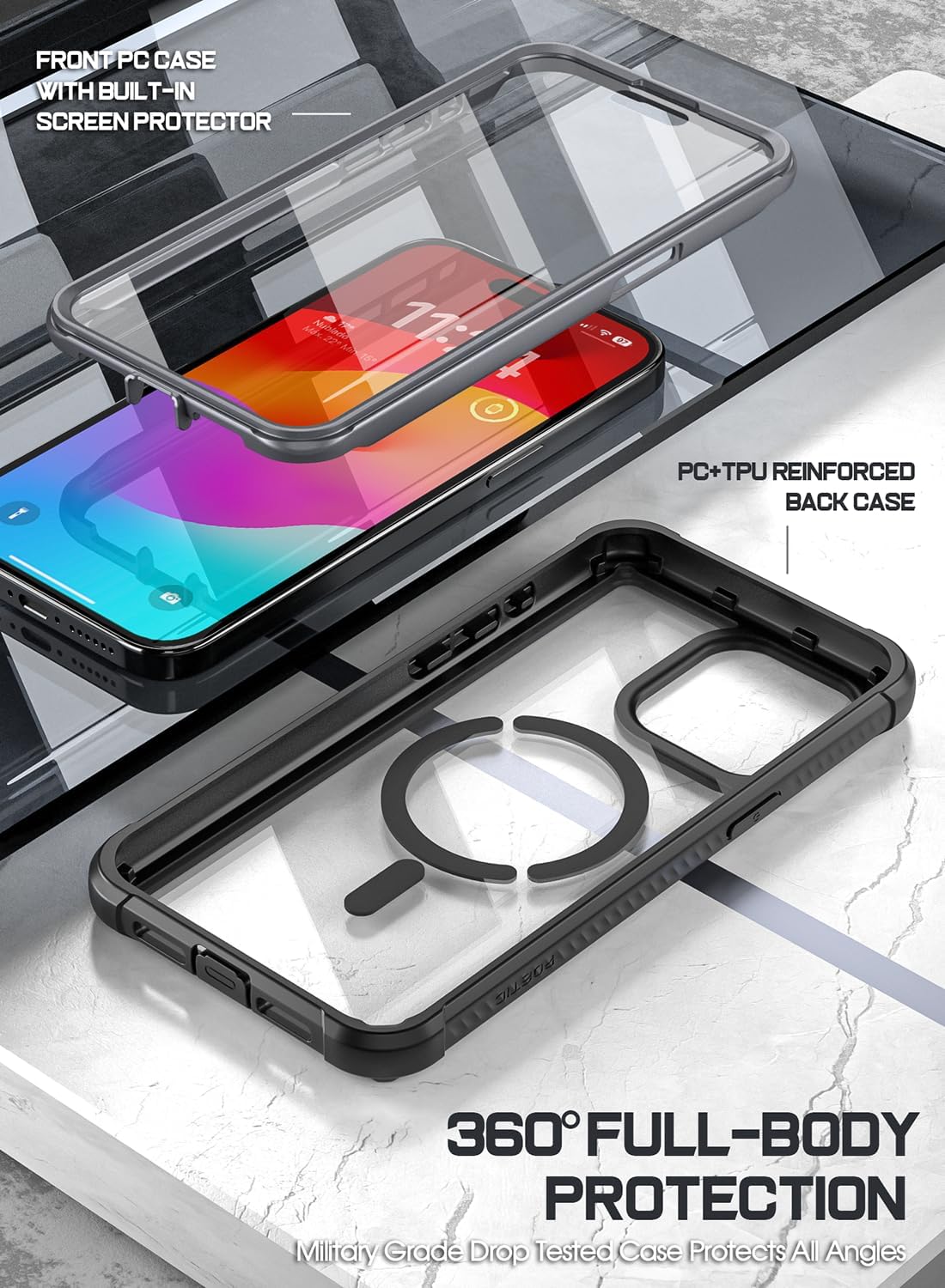 DESCRIPTION Poetic Guardian MagPro Case for iPhone 15 Series,[Compatible with MagSafe][20 FT Mil-Grade Drop Tested] Full-Body Shockproof Rugged Clear Cover with Built-in Screen Protector, Black/Clear. |
