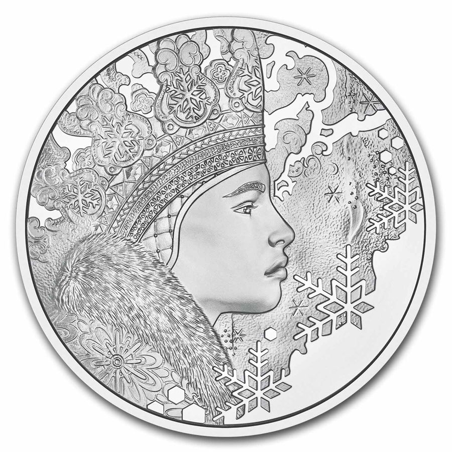 - Reverse: A young woman is shown in profile on the coins reverse. A manifestation of winter, she is a snow princess adorned in a crown and a cloak, both decorated with snow crystals. The background is partially polished around her crown and on the lower right-hand side.