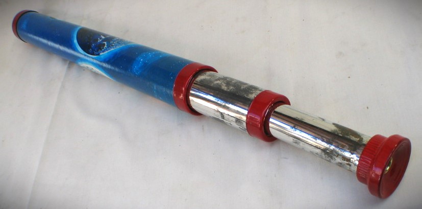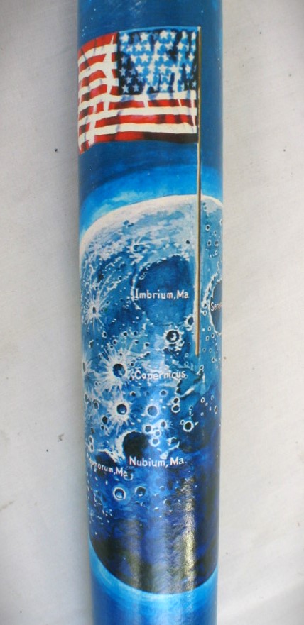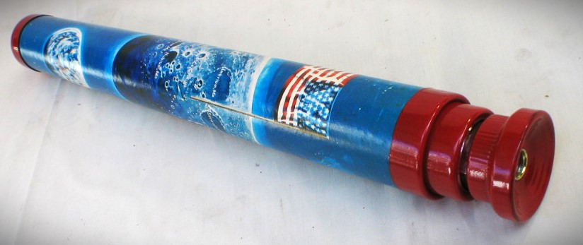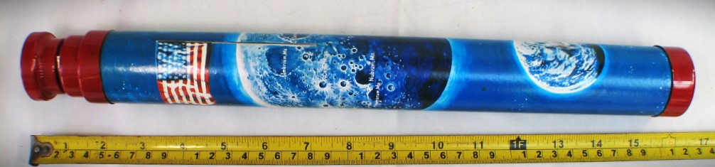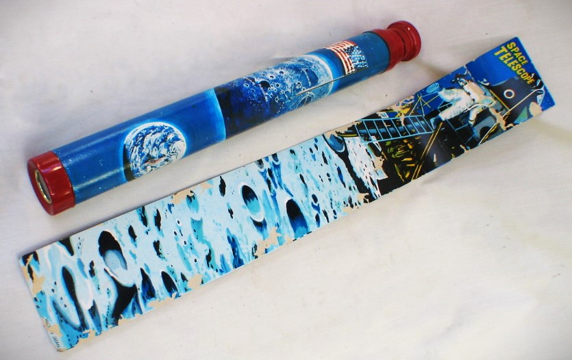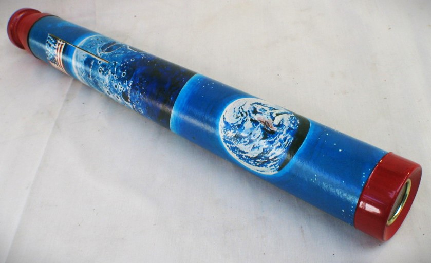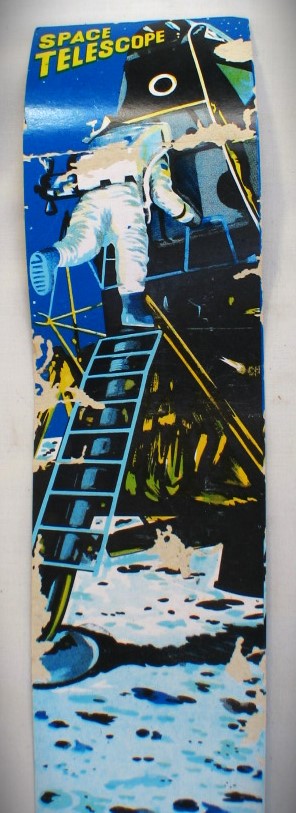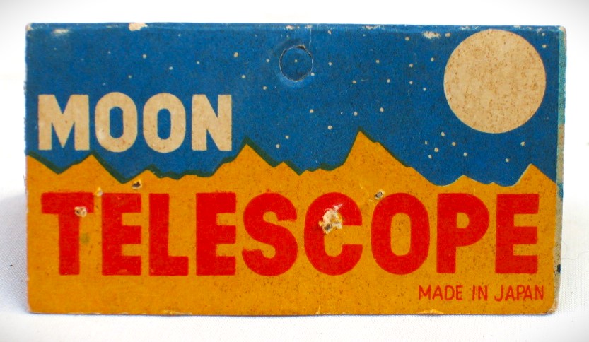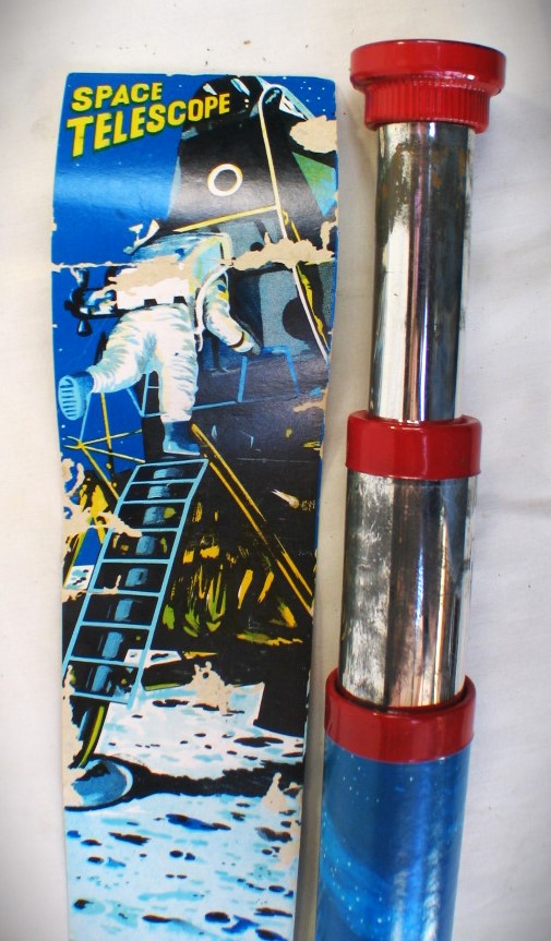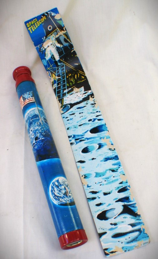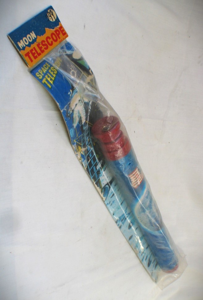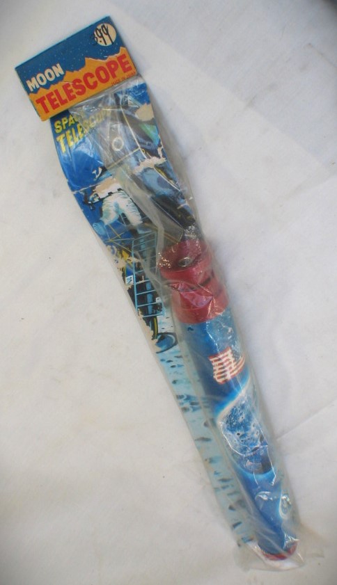 Vintage Tin Toy Moon Telescope -- New Old Stock with Original Package... Large toy telescope with image of a small earth and large moon, and has Apollo imagery like the flag on the moon... Toy is contemporary to the landing on the moon, 1960's, probably why it's called, "Moon Telescope"... Please see photos for details... Telescope toy measures about 16" closed... The outer portion is made of paper and the two inner tubes are tin...