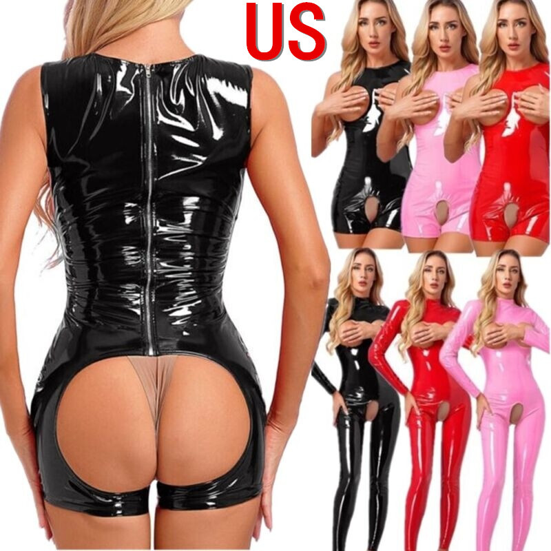 Womens PU Leather Strapless Bodysuit Lace-up Catsuit High Cut Leotard.