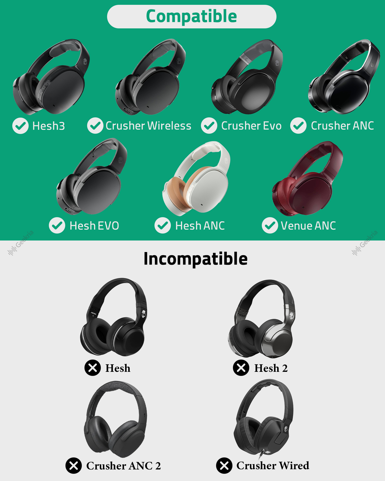 - Compatible with Skullcandy Crusher Wireless, Crusher Evo Wireless, Crusher ANC, Hesh 3 Wireless, Hesh Evo, Hesh ANC, - Compatible with Skullcandy Crusher Evo Collina Strada, Crusher Evo Budweiser Limited Edition earpads.