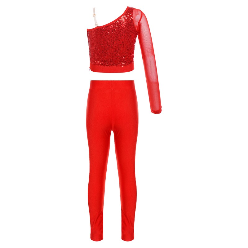 An unique one shoulder dance top with sheer mesh long sleeve on one side and adjustable spaghetti strap on the other.
