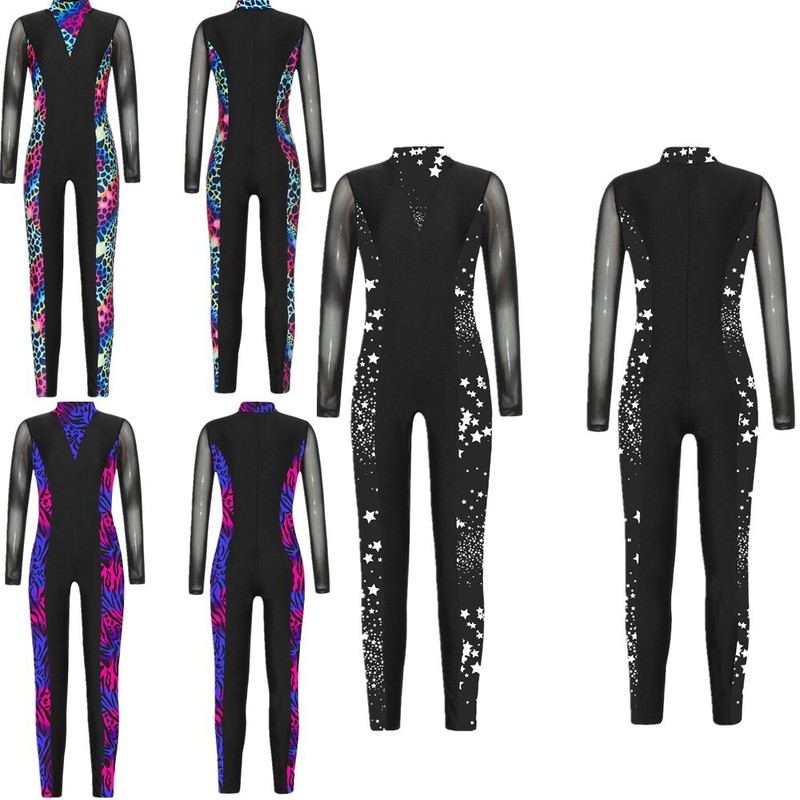 Mock neck, sheer mesh long sleeve, vibrant print makes girls more energetic, back zipper closure is easy to wear and take off.
