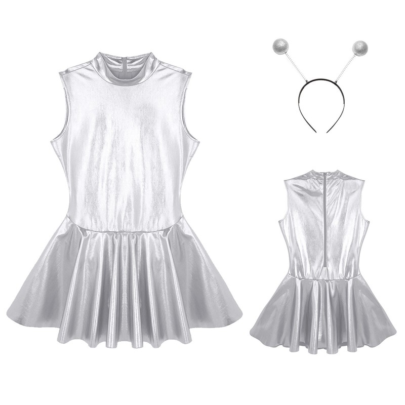 Women’s shiny metallic A-line dress, soft and strethcy fabric, back zipper closure.