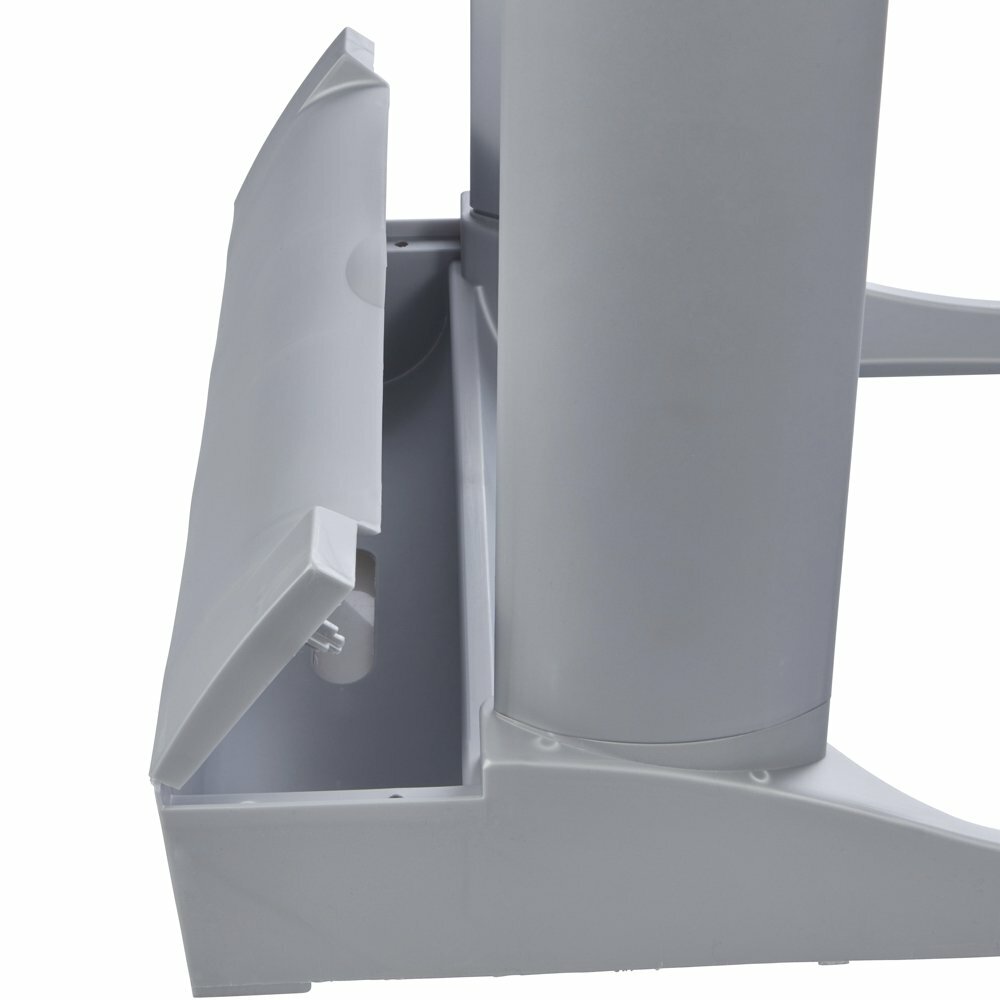 - Integrated storage compartment in base for bin bags