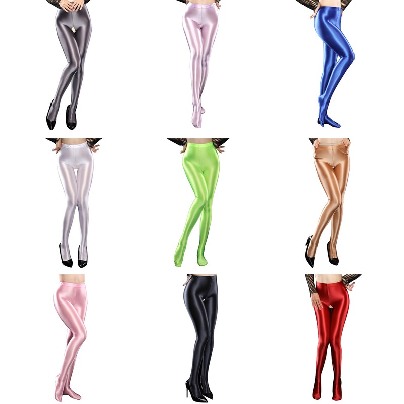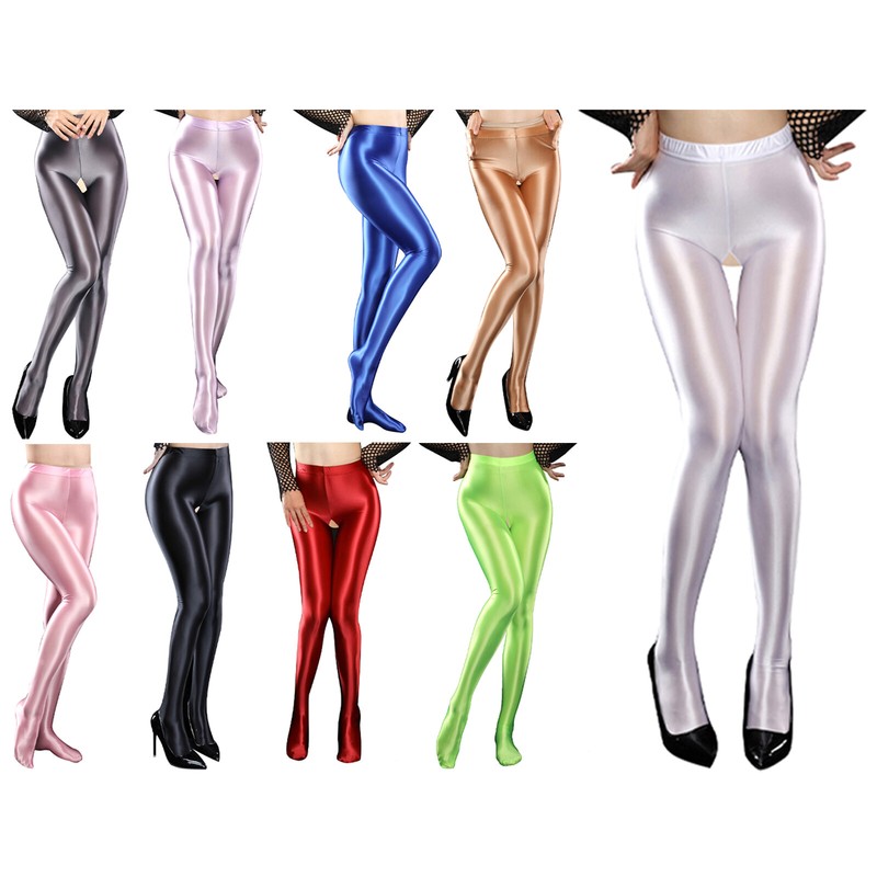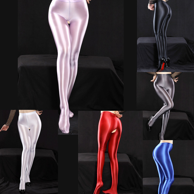 Stretchy pantyhose for women design with high rise, elastic waistband, crotchless, full-footed, opaque and glossy fabric.