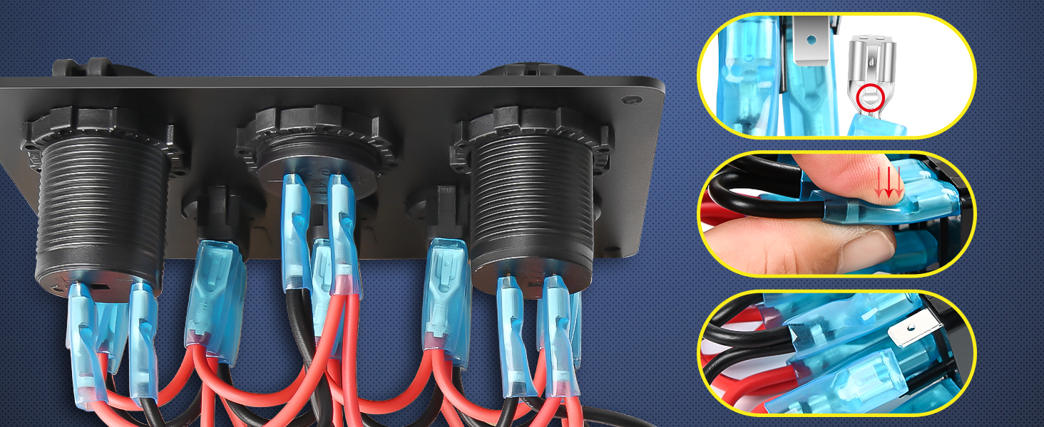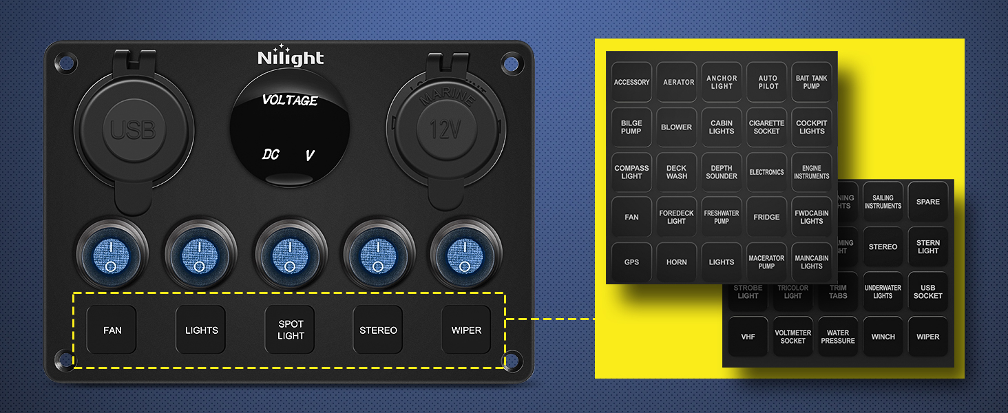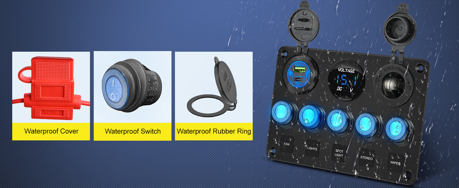Product integrated with a PD Type C and USB charger, digital Voltmeter, 12V outlet, waterproof panel, and 5 on/off toggle switches, this 12V/24V electrical panel can meet your various needs and widely applicable for most 12V-24V DC cars, UTVs/ATVs, trucks, trailers, RVs, caravans, buses, marine boats, yachts, airplanes, etc.