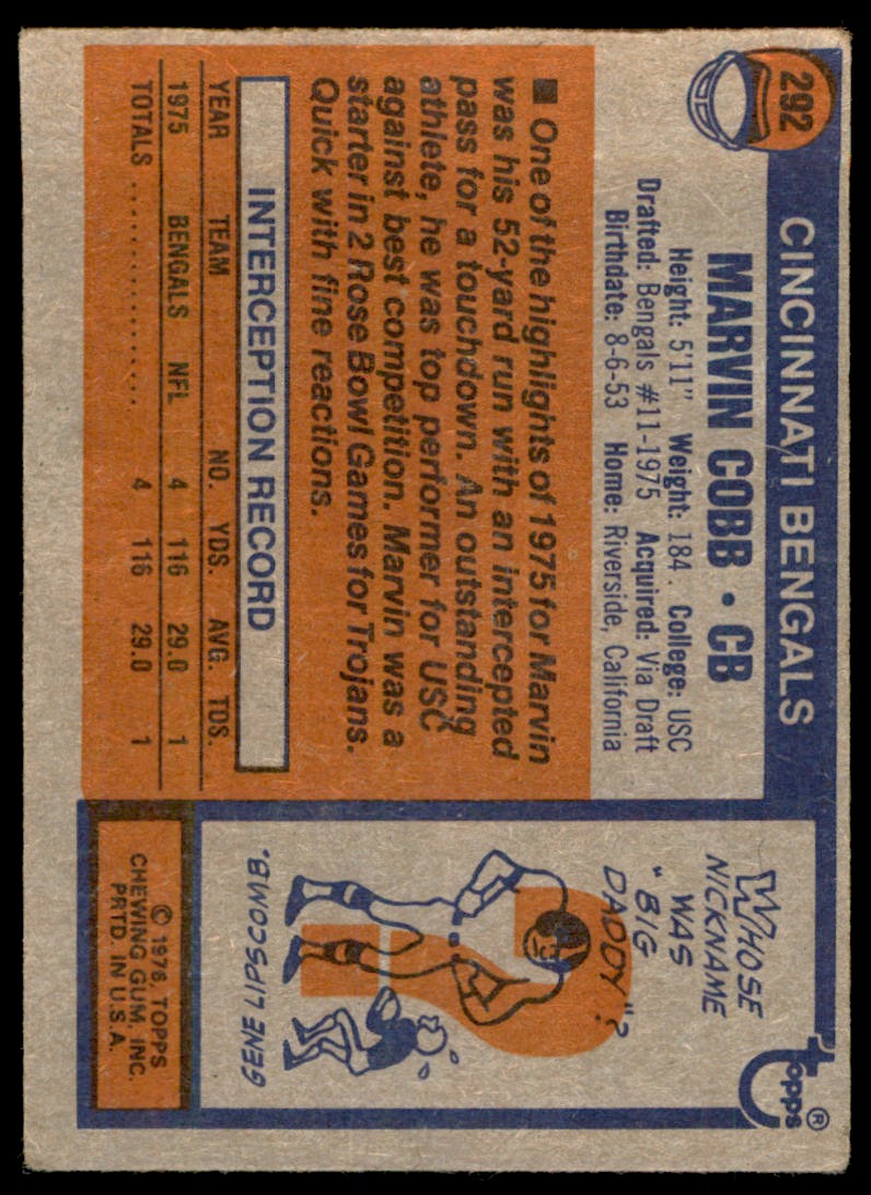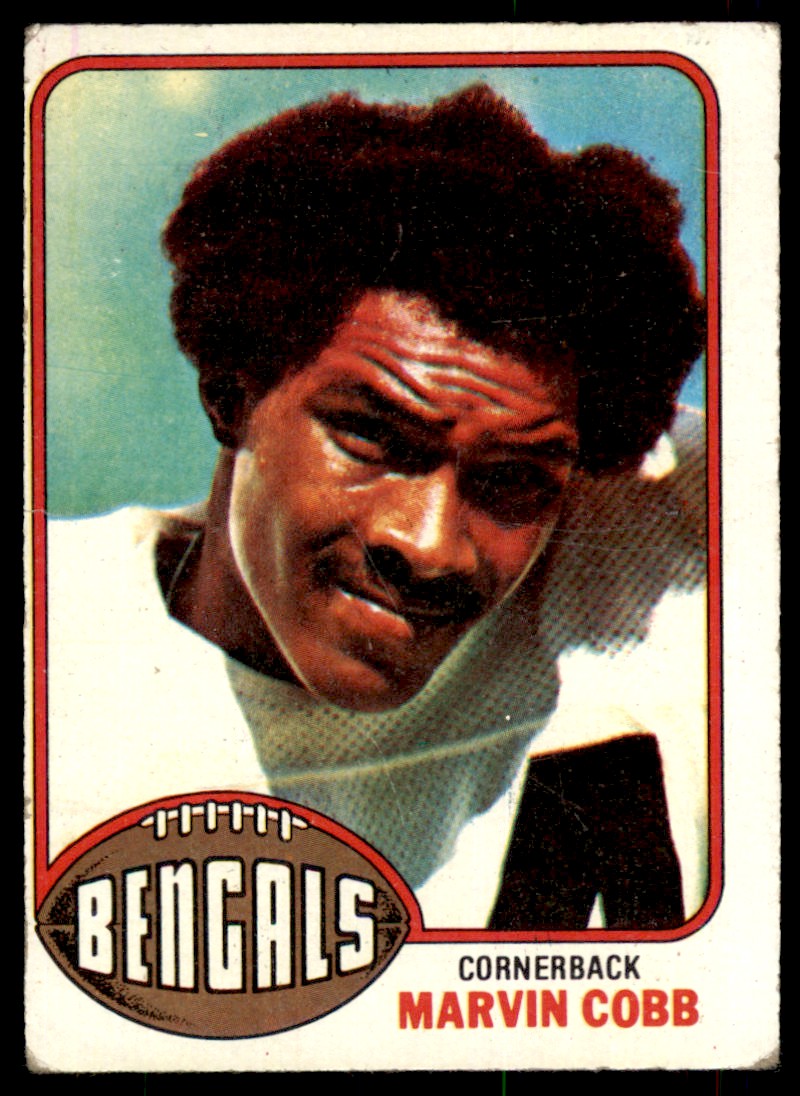 | Description: | Marvin Cobb | | Category: | Football | | Year: | 1976 | | Product: | Topps | | Team: | Cincinnati Bengals | | Card Number: | 292 | | Rookie: | Yes | | Memorabilia: | . | | Special: | | | Dimensions: | 3½" x 2½" |