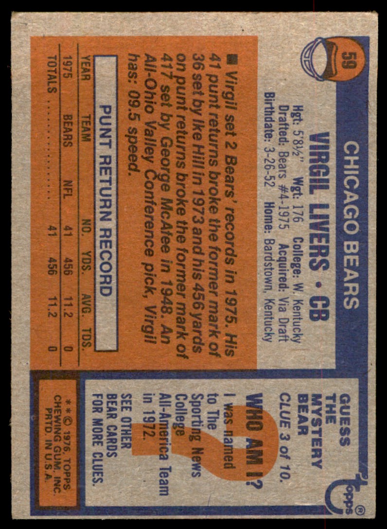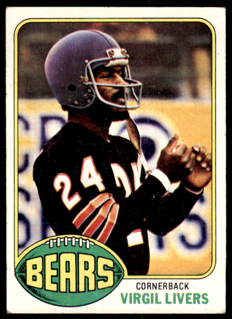 | Description: | Virgil Livers | | Category: | Football | | Year: | 1976 | | Product: | Topps | | Team: | Chicago Bears | | Card Number: | 59 | | Rookie: | Yes | | Memorabilia: | . | | Special: | | | Dimensions: | 3½" x 2½" |