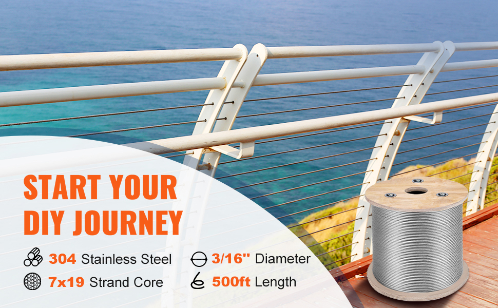 Our wire rope is made of 304 stainless steel, providing unstoppable rust and corrosion resistance. With a 7 x 19 construction, it is tightly wound together for even and neat cuts. It has a 3,700 lb breaking strength and 840 lb working strength for durability and longevity. The polished surface is gentle on your hands. It is widely used outdoors and indoors, making it the # 1 choice for clotheslines, stair cable railings, garden fences, shipbuilding, etc. An excellent assistant in your daily life! The choice is obvious with VEVOR.
