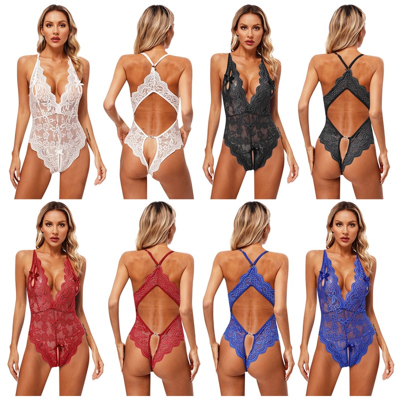 One-piece bodysuit designs with plunging V neck, adjustable straps, X-back, open crotch and butt showing, making you a frivolous stunner.