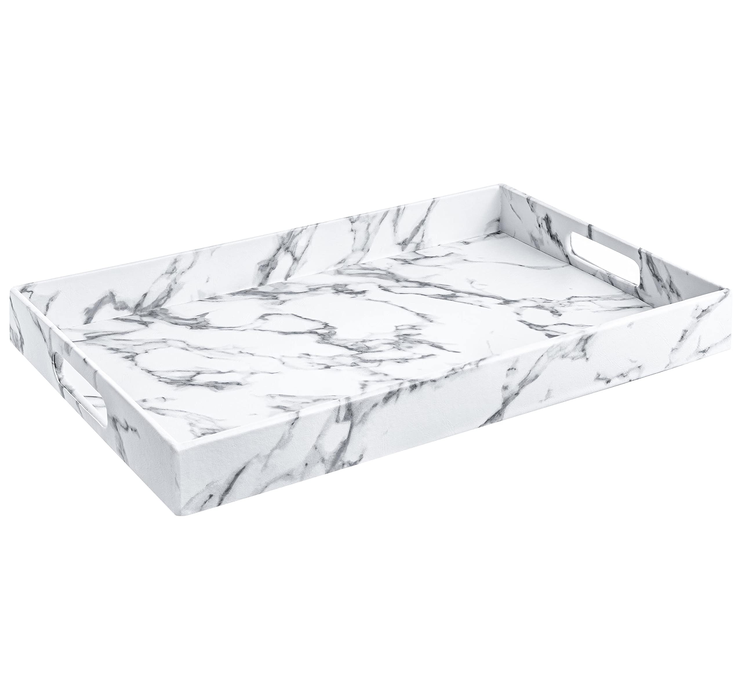 Hot New Release Amazing Awesome rectangle serving tray from Home Redefined . It is made of polyurethane & MDF and has handles for easy serving. Available exclusively at Home Redefined , this fashion-forward tray makes a chic statement for serving drinks, presenting hors d'oeuvres or displaying favorite objects or perfumes. Also great for for placing on a Coffee table and serving hot drinks, Tea , Coffee Hot Chocolate. Or Serve Wine with Wine glasses . If your the business type you can place it on your desk and place documents on it or simply place on dining room table and place a vase on it with flowers , Another idea is to place mail / envelopes so you can remember where you left it and stay organized . Of course you can use it to serve breakfast in bed .This faux leather marble tray with handles is a excellent choice for the whole family! Our goal is to provide you the highest quality and trendy products for your home . We are planning on adding new colors to the lineup please let me know what colors interest you ! Please Note This Tray Is Not Food Safe, Meaning Not Safe To Place Food Directly On The Tray, You Need To Place The Food On A Plate Etc Then Place The Plate On The Tray. Also Please Note This Tray Is Made From Materials Subject To Prop 65.
