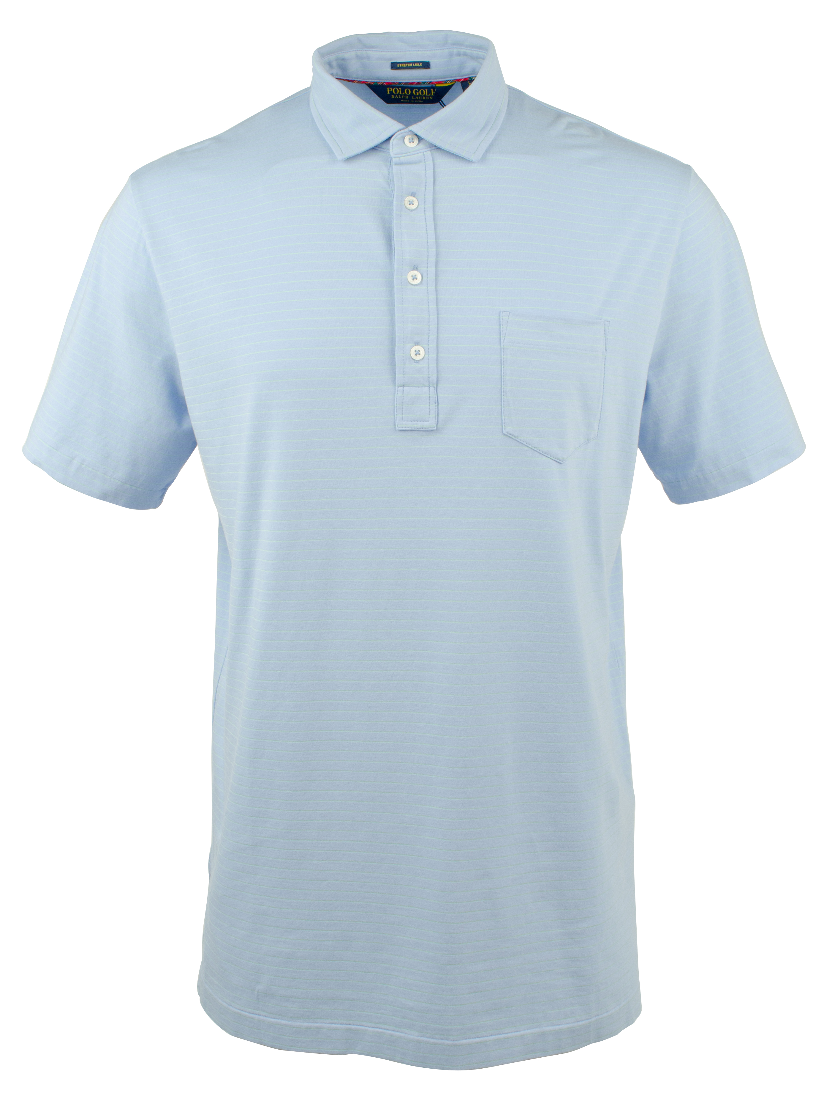 - Polo collar, four-button placket, left chest pocket