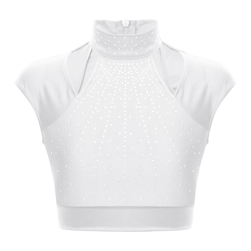 Girl’s top is decorated with shiny rhinestones to brighten up any performance and create an eye-catching effect.