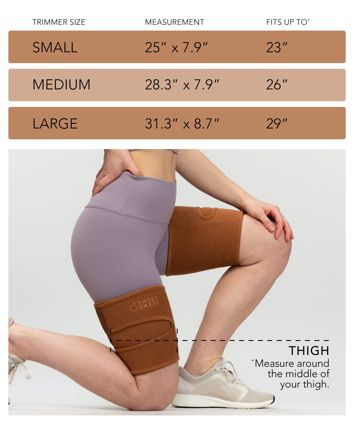 The Sweet Sweat Thigh Trimmer compresses and supports your thigh area while retaining therapeutic heat. As a result, you'll not only Tone and shape your thighs but also minimize the occurrence of pulls and strains to the Quad. and hamstring. The Thigh Trimmers are made of thermal 100-percent latex-free neoprene, with a nylon facing on the outer side and a contoured design for comfort. Quick Tips: Neoprene products produce a sauna-like effect on the skin, it is very important to stay hydrated when exercising with the Sweet Sweat Thigh Trimmers After each use whip waist trimmer down with a dry cloth Caution! Some individuals may be sensitive to Neoprene blend products. Avoid using the Sweet Sweat Waist trimmer if you are susceptible to dermatitis. If a rash develops discontinue use