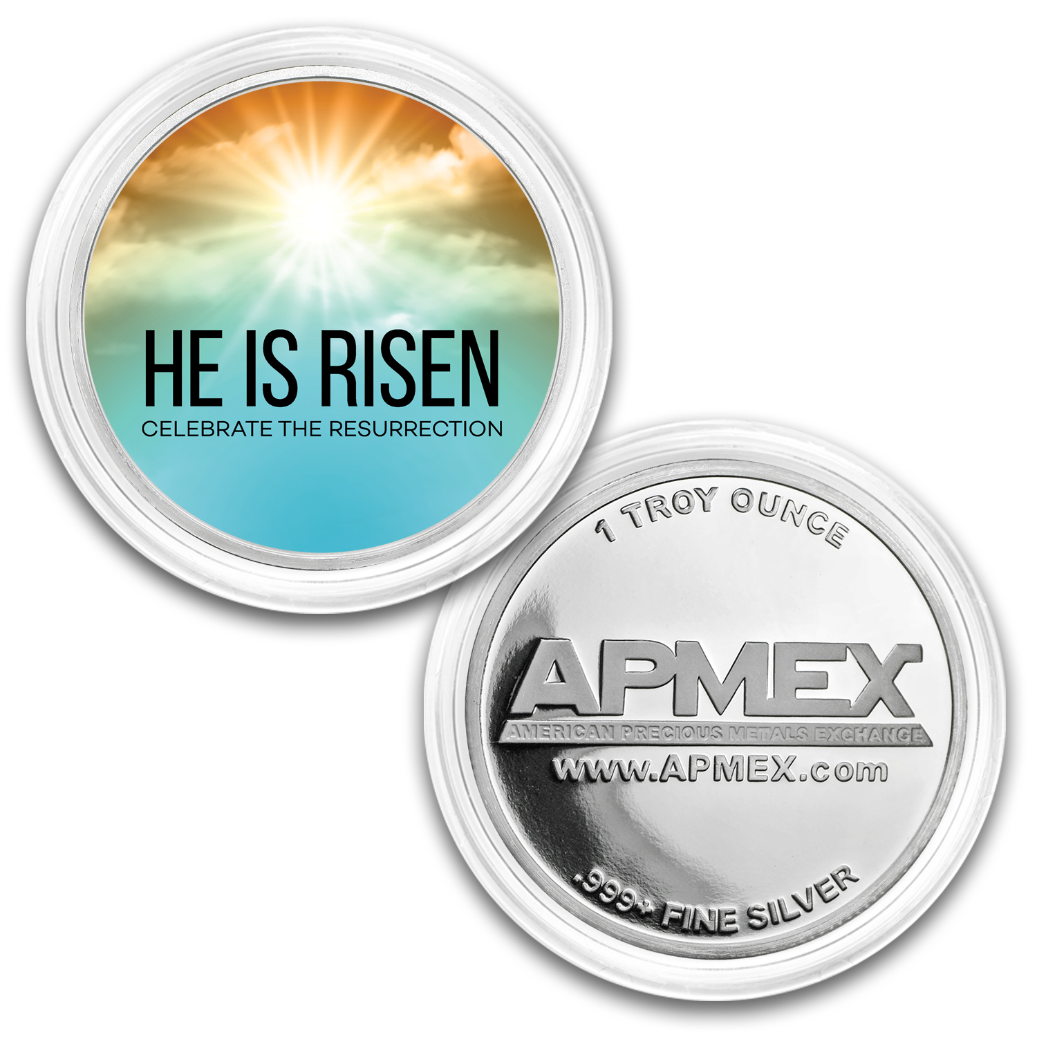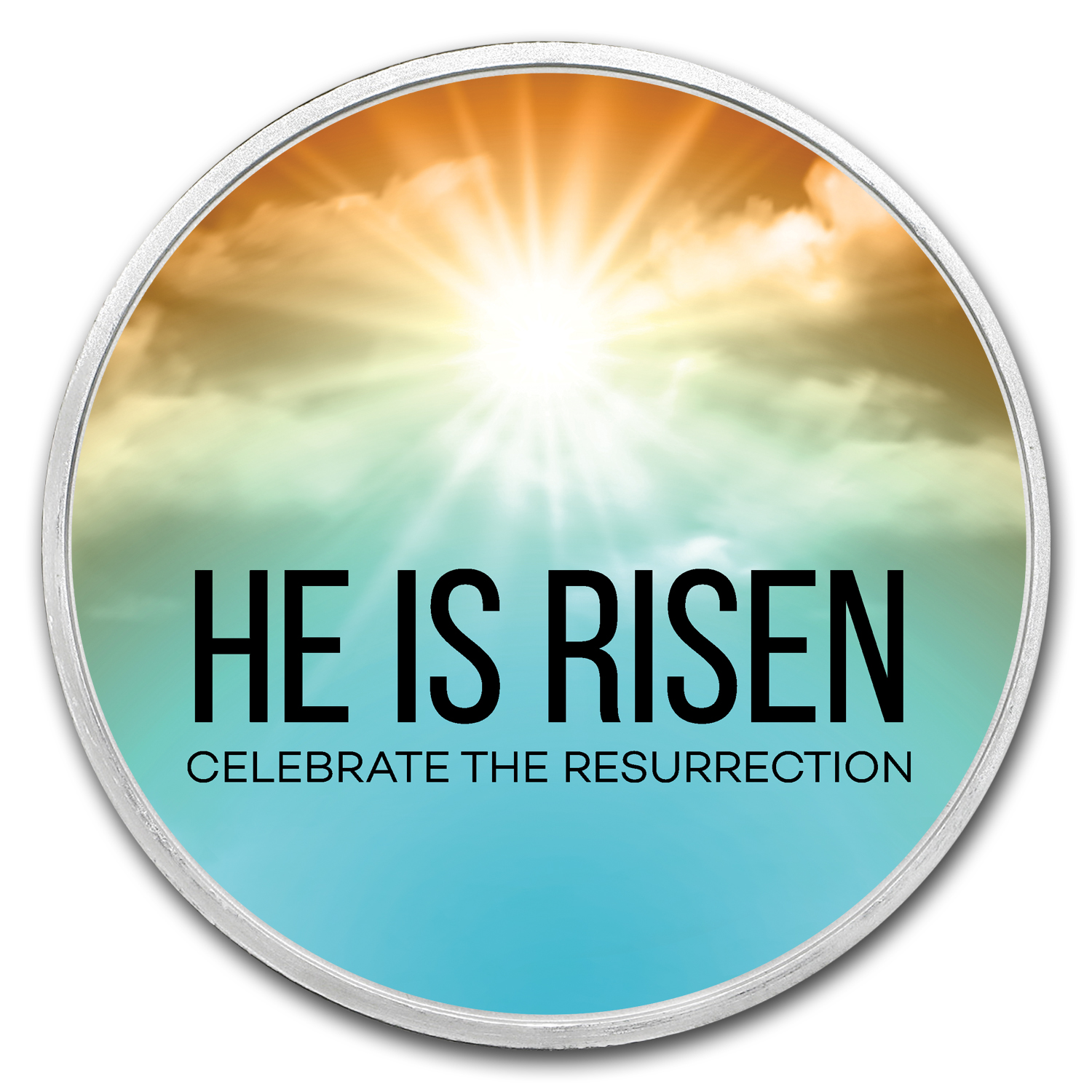 - Obverse: Features a beaming sun with a colorful heaven-like sky and the words, HE IS RISEN and Celebrate the Resurrection.