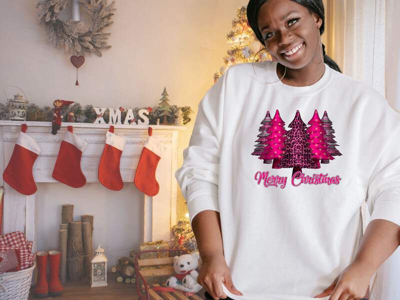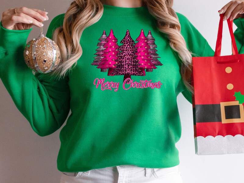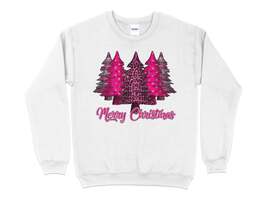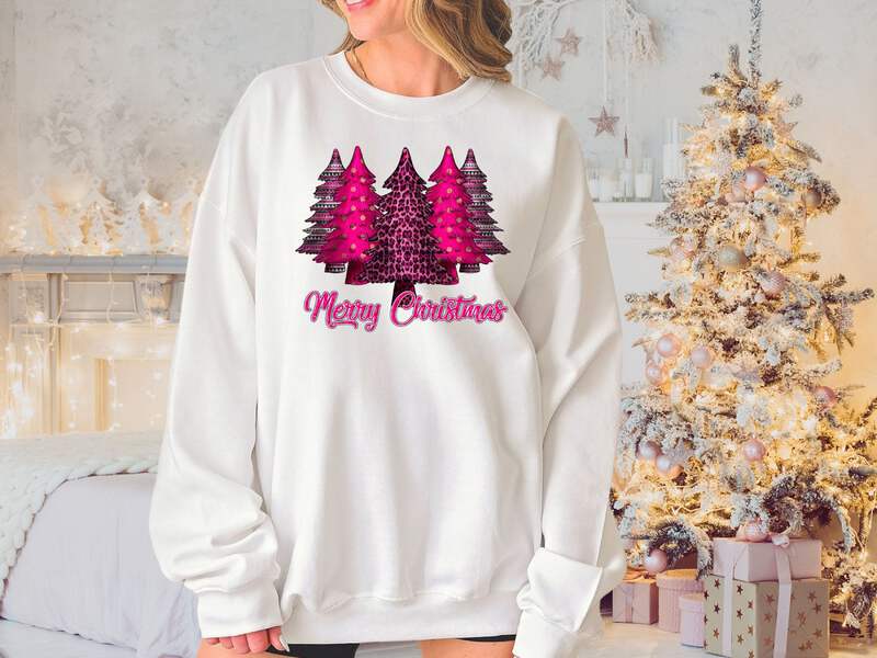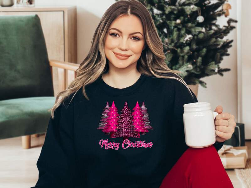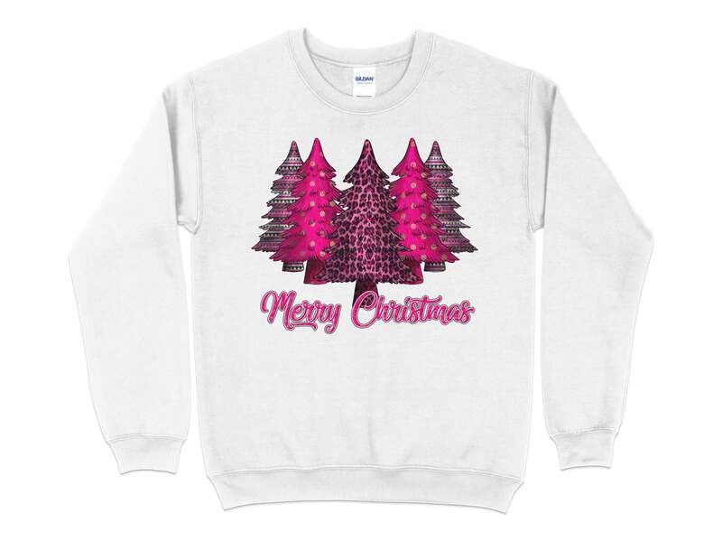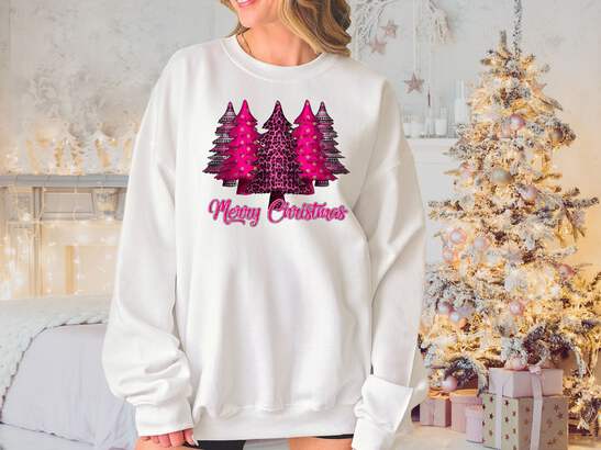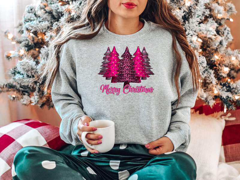 Crafted from high-quality Gildan 18000 fabric, it offers both comfort and durability. The cheerful pink color and festive tree design make it an ideal choice for holiday gatherings or cozy nights in.