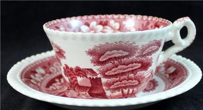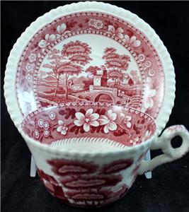 This vintage pattern was manufactured by Spode from 1954 through 2007 before being retired. It features an overall pink design on cream depicting an arched stone toll bridge over a stream in a rural scene, at center, with an intricate floral & leaf border along rope edge.