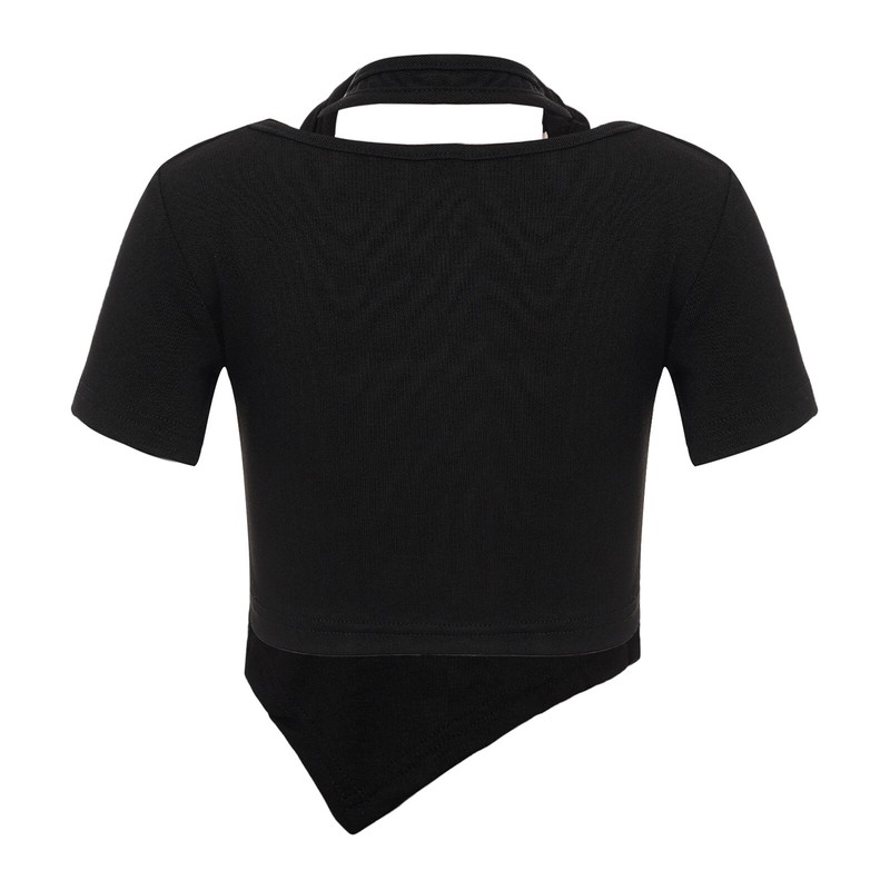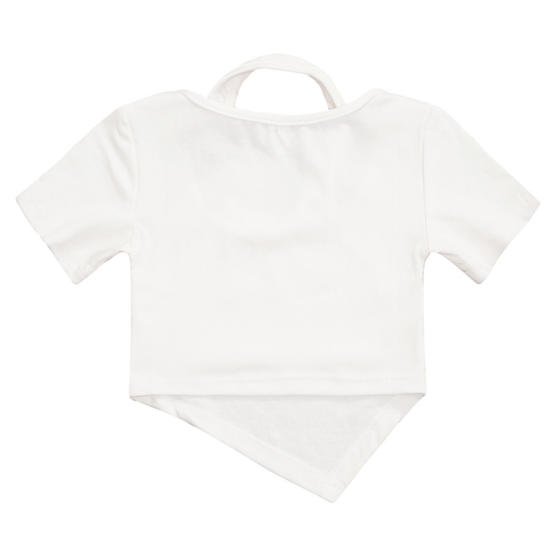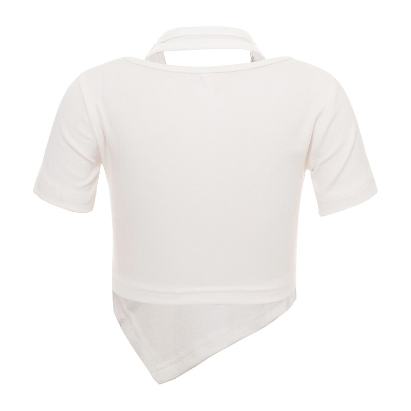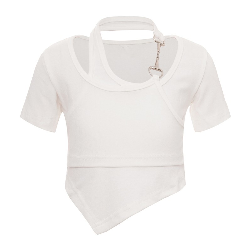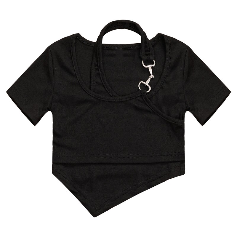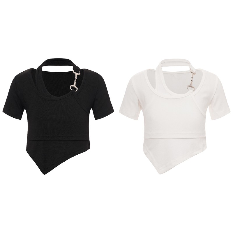 Short sleeve crop top for girls, round neck and halter with metal ornament for a unique and stylish look.