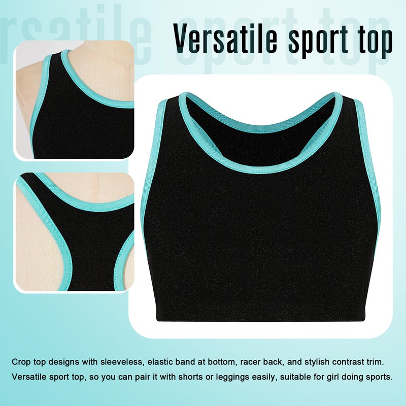 Crop top designs with sleeveless, elastic band at bottom, racer back, and stylish contrast trim.