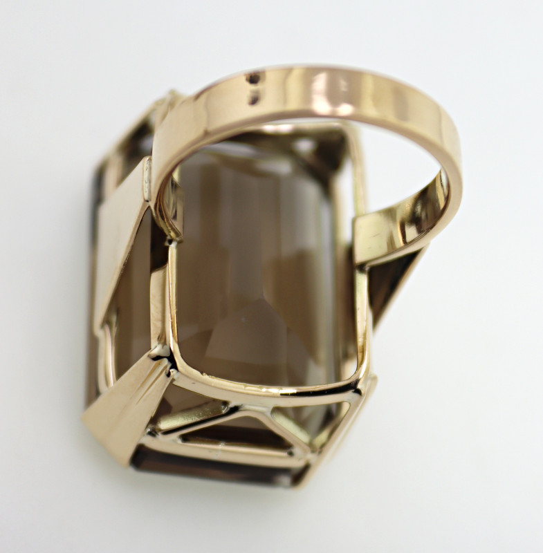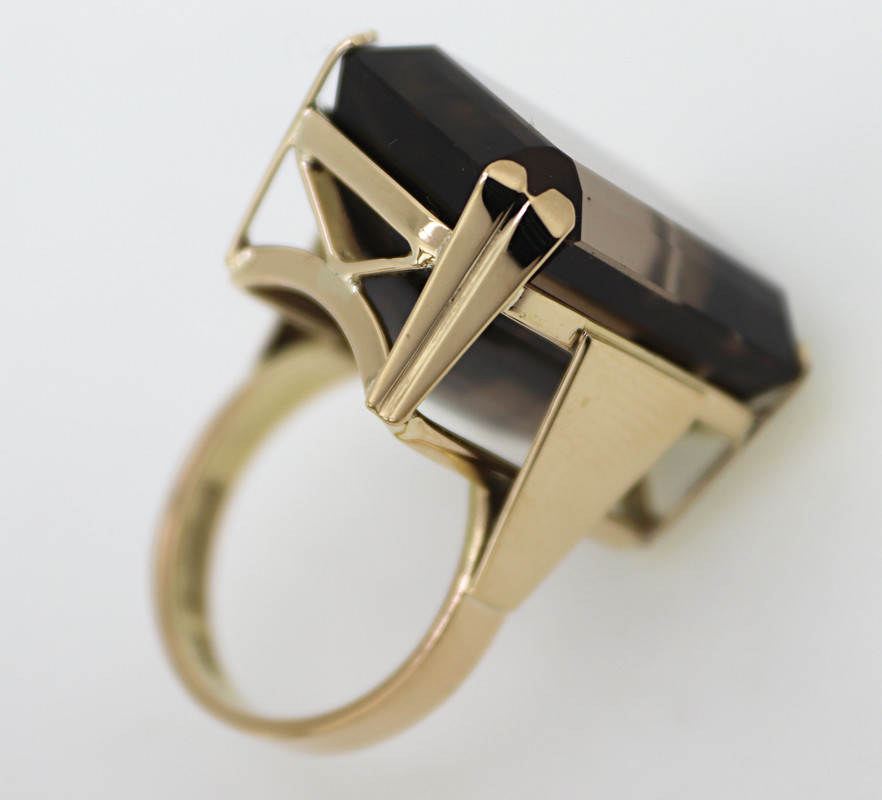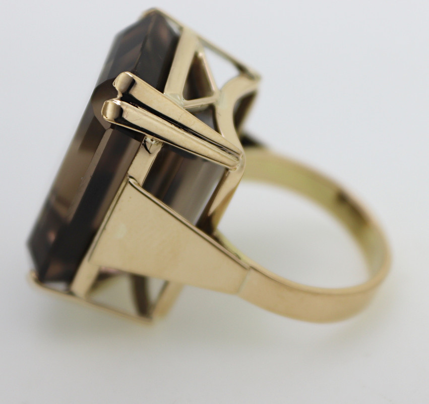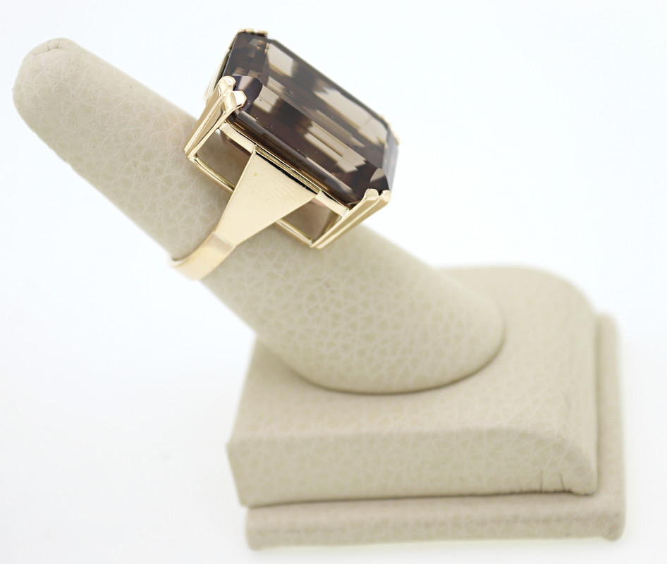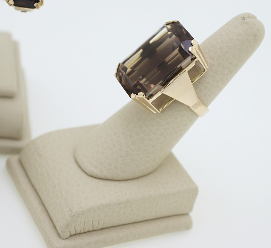 emerald-cut smoky quartz, 14k yellow gold ring, size 6.5; together with a matching pair of 11 ct.