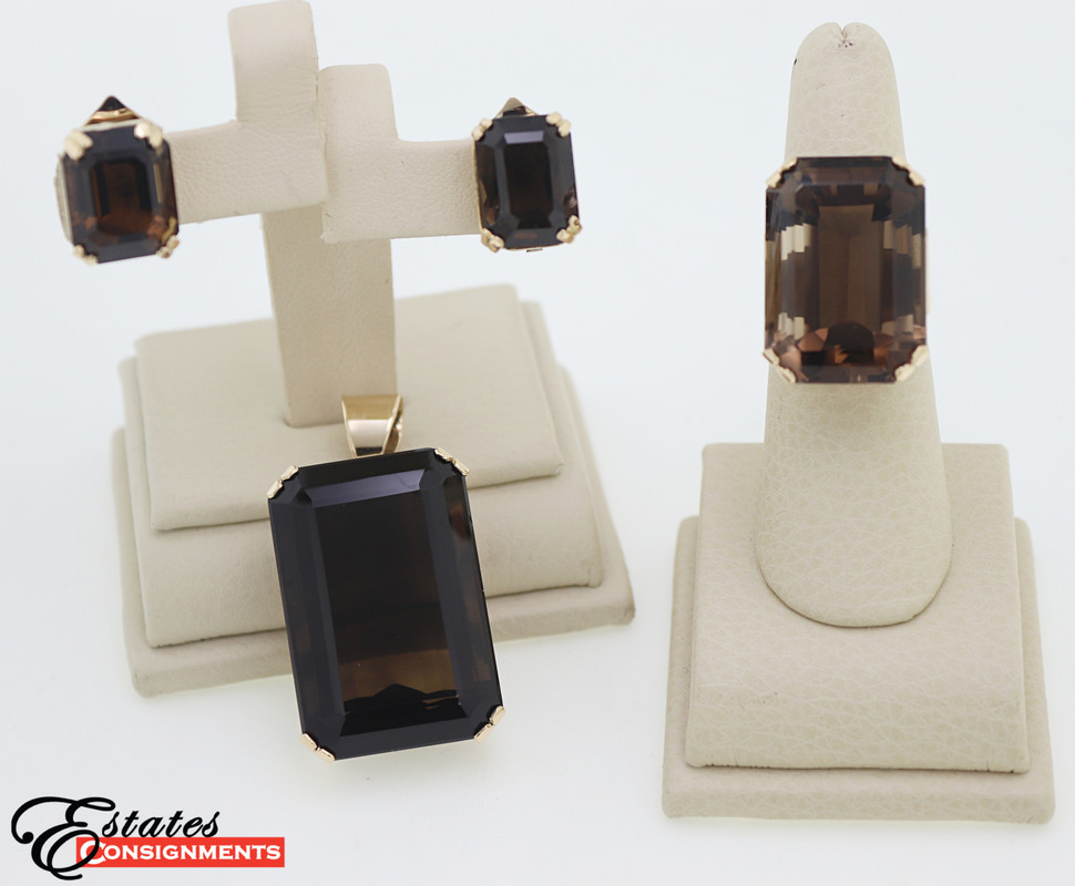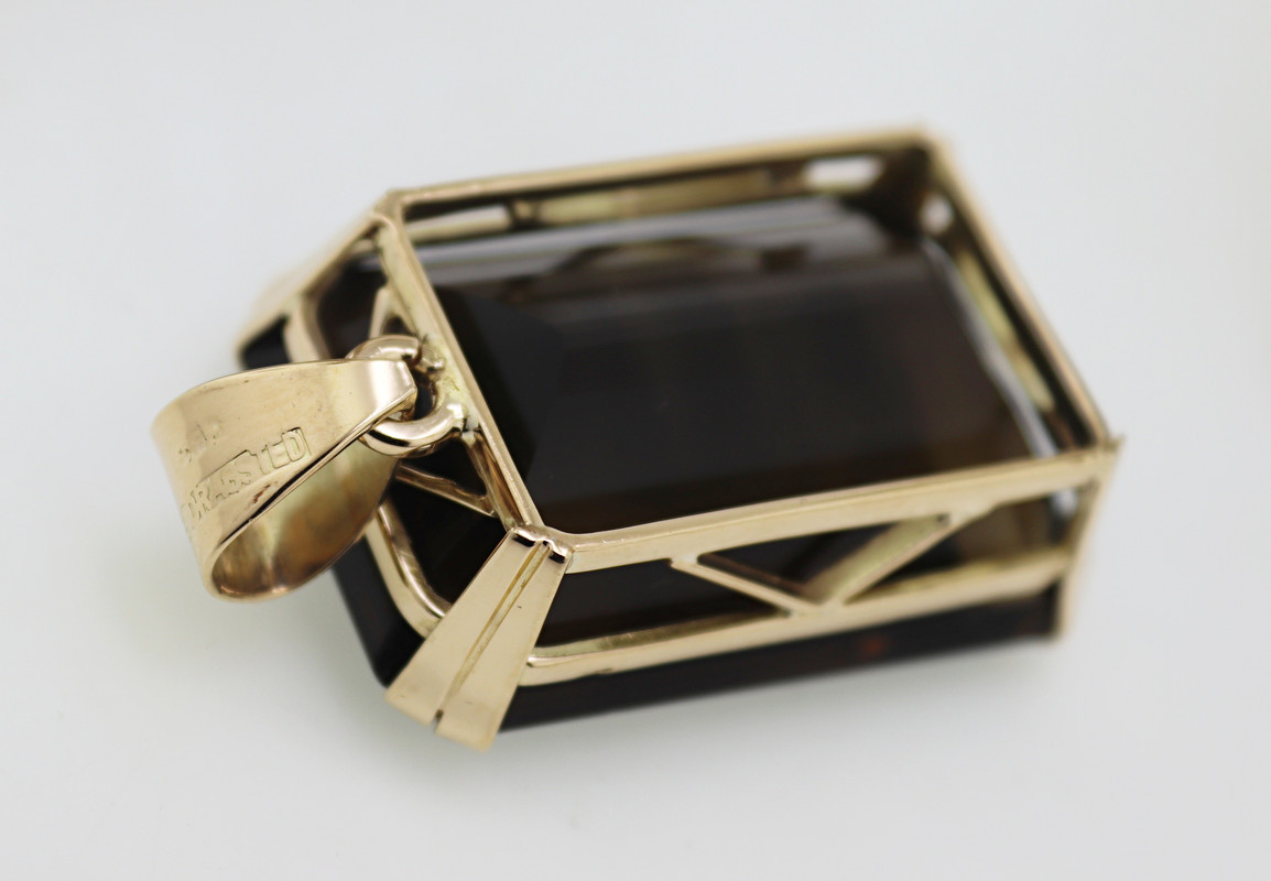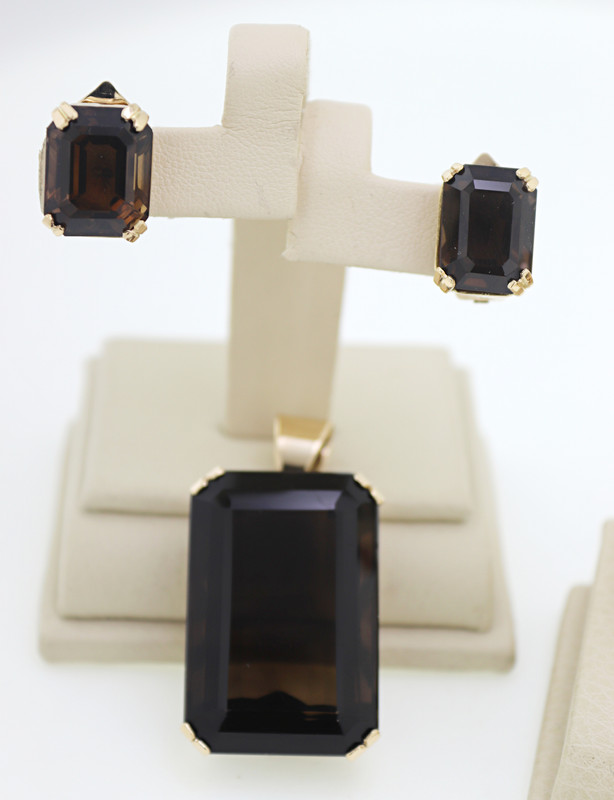 Composed of one 70 ct. emerald-cut smoky quartz, 14k yellow gold pendant; one 39 ct.