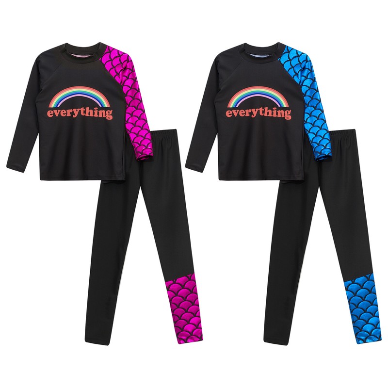 Long sleeve, long pants, rainbow print with glossy fish scales patchwork make kids more stylish on beach.