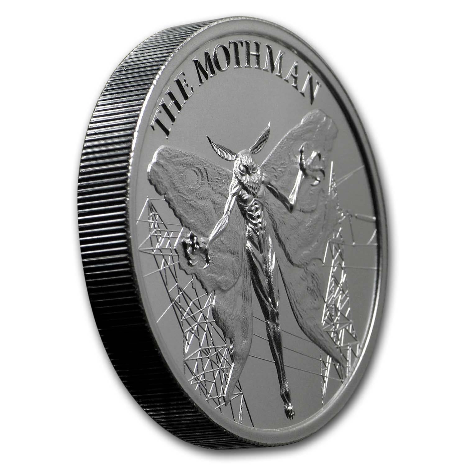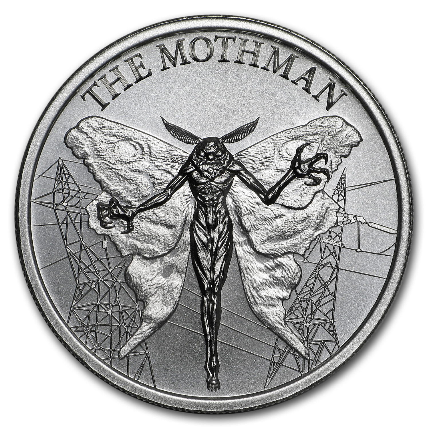 - Obverse: Features a detailed depiction of the Mothman showing its large wings against a background of high-tension electrical wire towers.