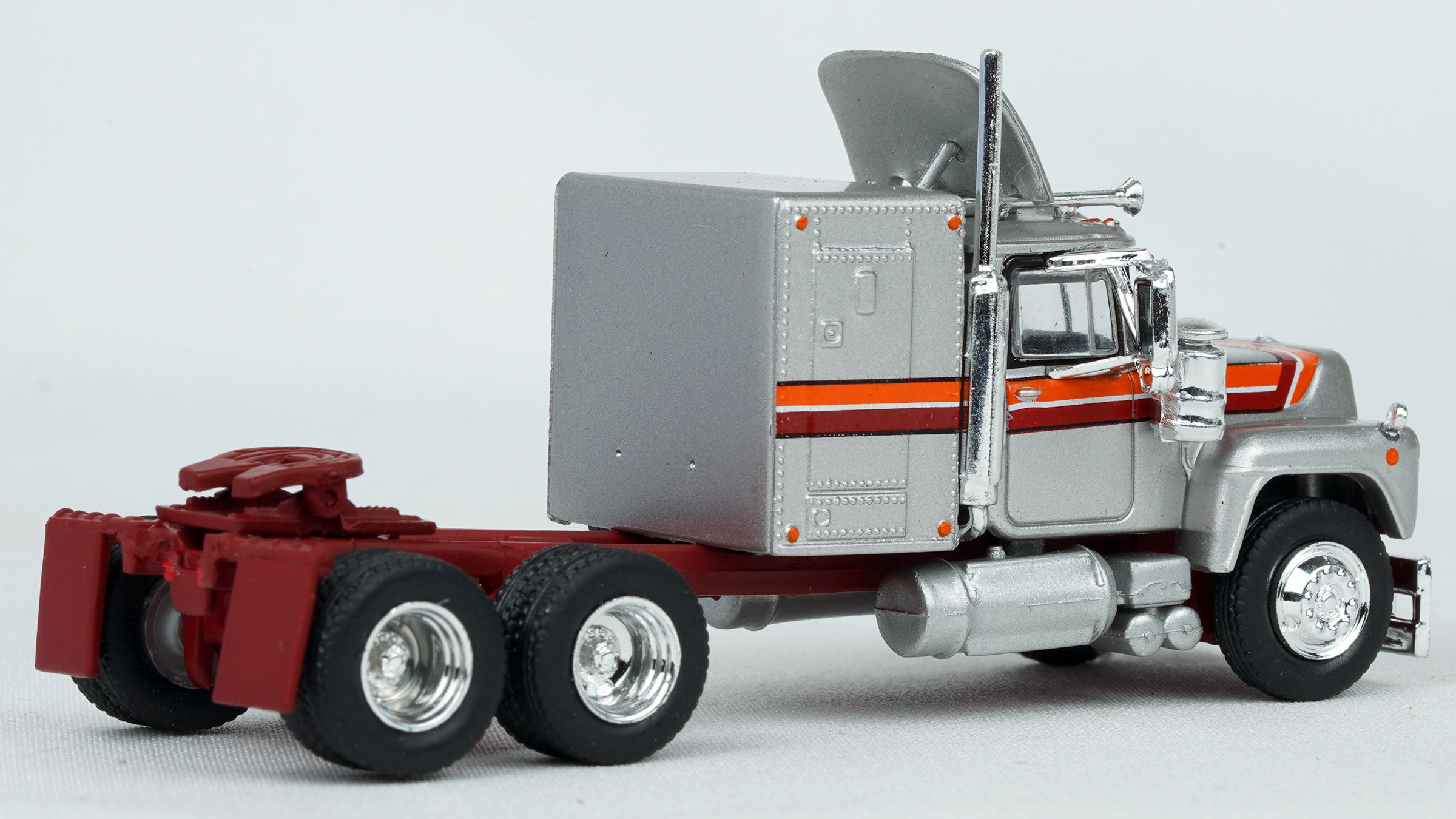 Brekina Mack RS700 tandem axle truck tractor 60" sleeper Prototype produced from 1966 to 1990s(!) Silver paint with maroon & orange stripes No commercial markings Chrome mirrors (buyer installed) Chrome grille, bumper, trim Dual chrome horns Two hole steel disc type wheels February 2024 release New in box SKU #85806