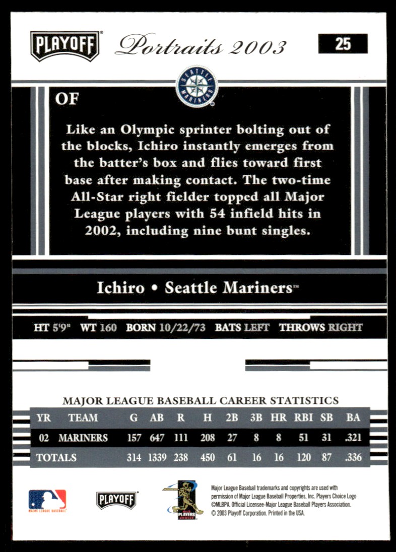 | 2003 Playoff Portraits Baseball Card Ichiro Suzuki Seattle Mariners #25 NM |