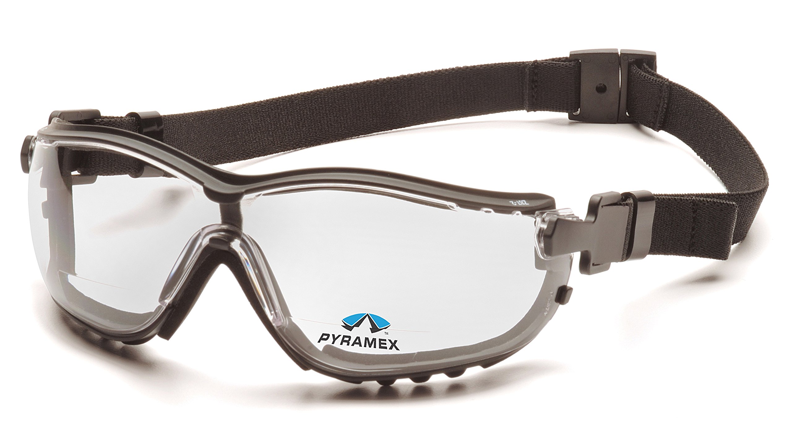 Pyramex V2G clear anti-fog reader lens with black strap/temples features: - lens insert is out of user's direct line of vision - lens and vented to inple tips: 146mm - lens base: 9.5 Curve - lens size diagonal: 81.1mm - lens size vertical: 54mm - lens thickness: 2.1mm - Overall Length (lens-tip): 81mm - Overall Width (hinge-hinge): 143mm - PD: 68mm Weight: 38gm - strap length: 443mm.