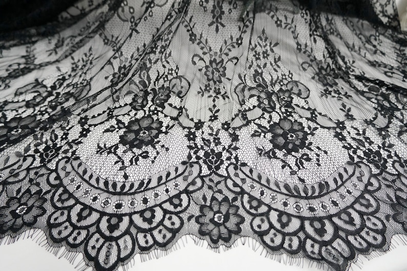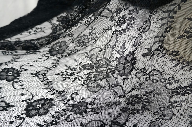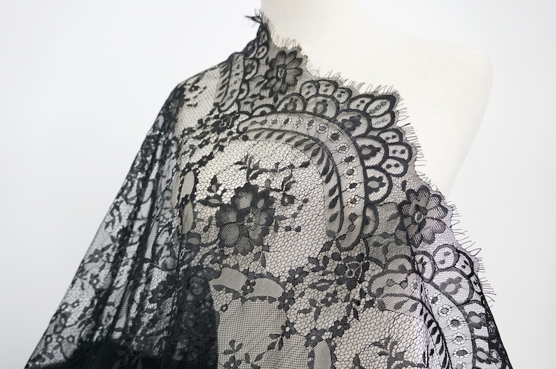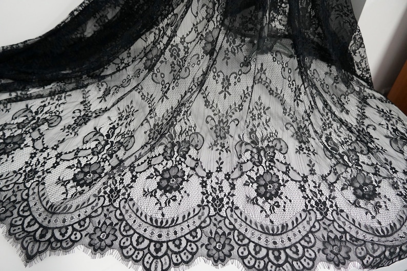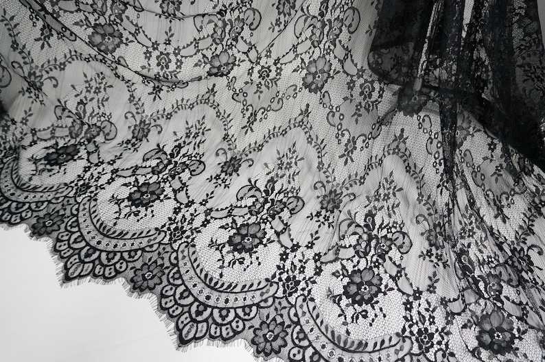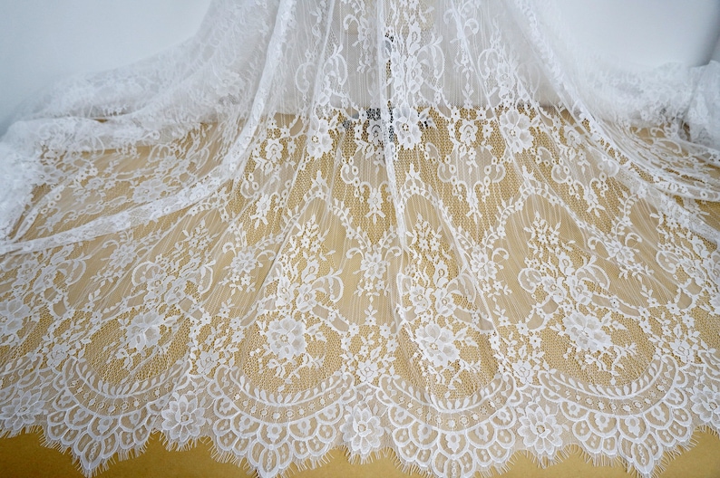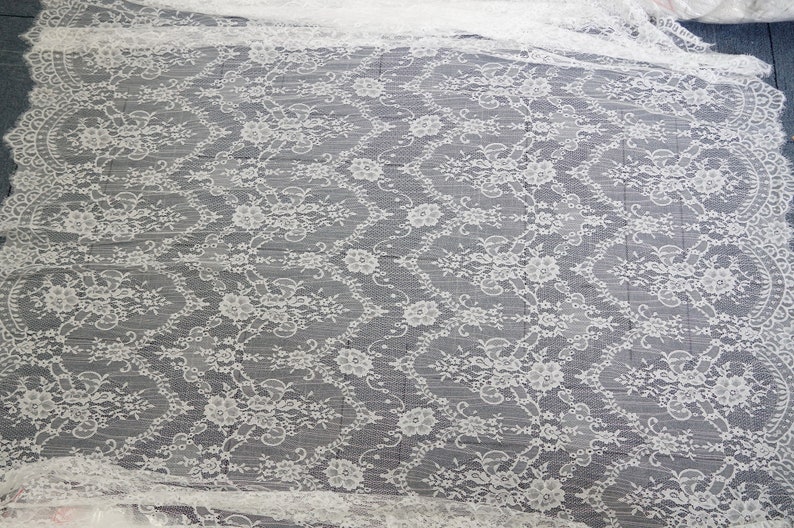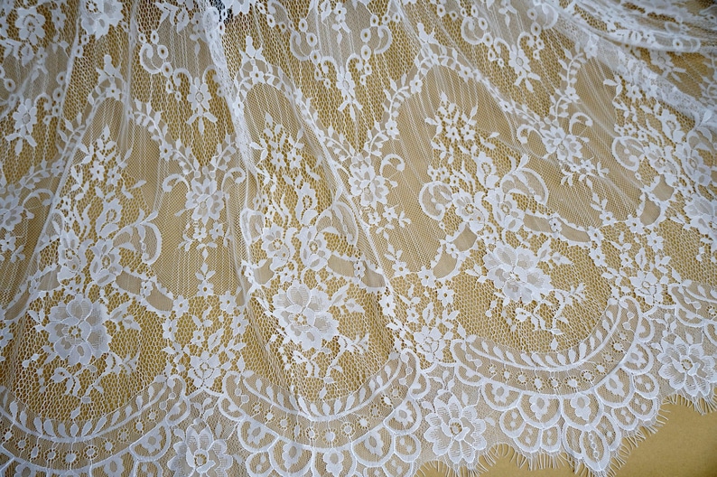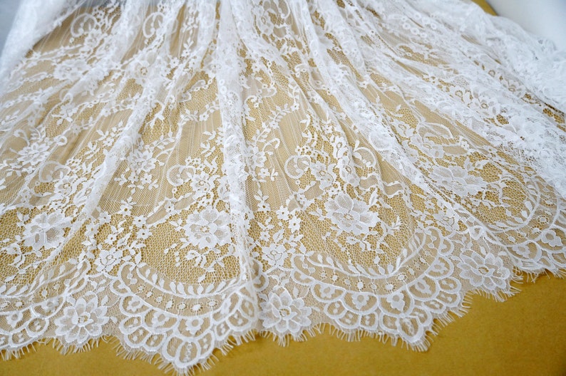 This lightweight Chantilly lace dress fabric has scalloped borders top and bottom, Soft Exquisite Chantilly lace wedding dress fabric for the most beautiful bridal gowns.