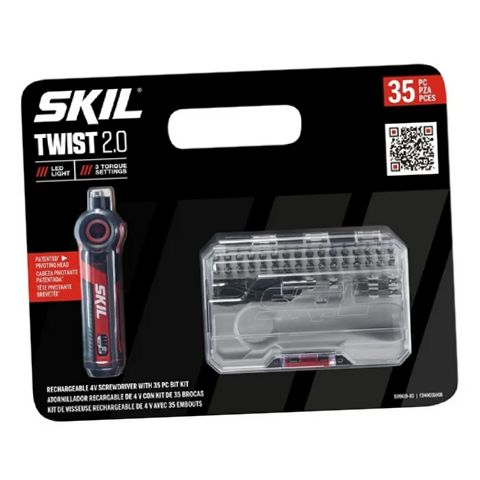 SKIL 4V Rechargeable Screwdriver with 35-Piece Bit Kit From assembling furniture and toys to tightening screws in hard-to-reach cabinets get small jobs and repairs done quickly and comfortably with the SKIL 4V Rechargeable Screwdriver with 35-Piece Bit Kit. This ergonomic electric screwdriver features a patent-pending pivoting head that locks between three positions 0 22.5 and 45 degrees for improved comfort in tight spaces. It features three torque settings that allow you to adapt to the application at hand. Its trigger button is conveniently located for easy one-finger use and its bright LED lights up dark spaces. The cordless screwdriver s integrated battery features a USB-C charging port with included cable for convenient recharging. This cordless electric screwdriver kit comes with a 35-piece set of commonly used bits including (32) 1" bits (2) 2" slim bits and a 2-3/8" magnetic bit holder.
