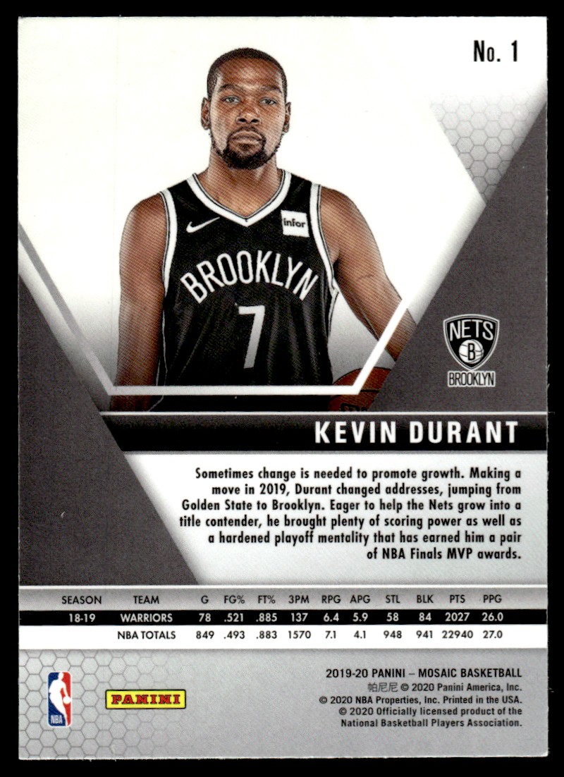 | 2020-21 Panini Mosaic Basketball Card Kevin Durant Brooklyn Nets #1 |