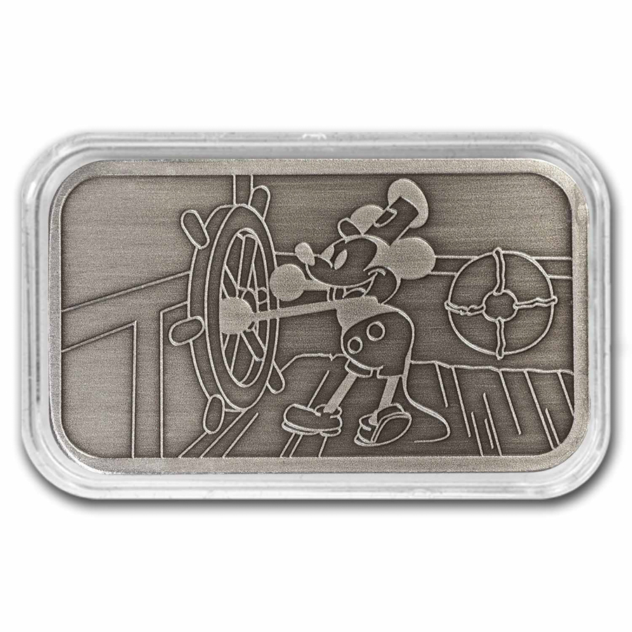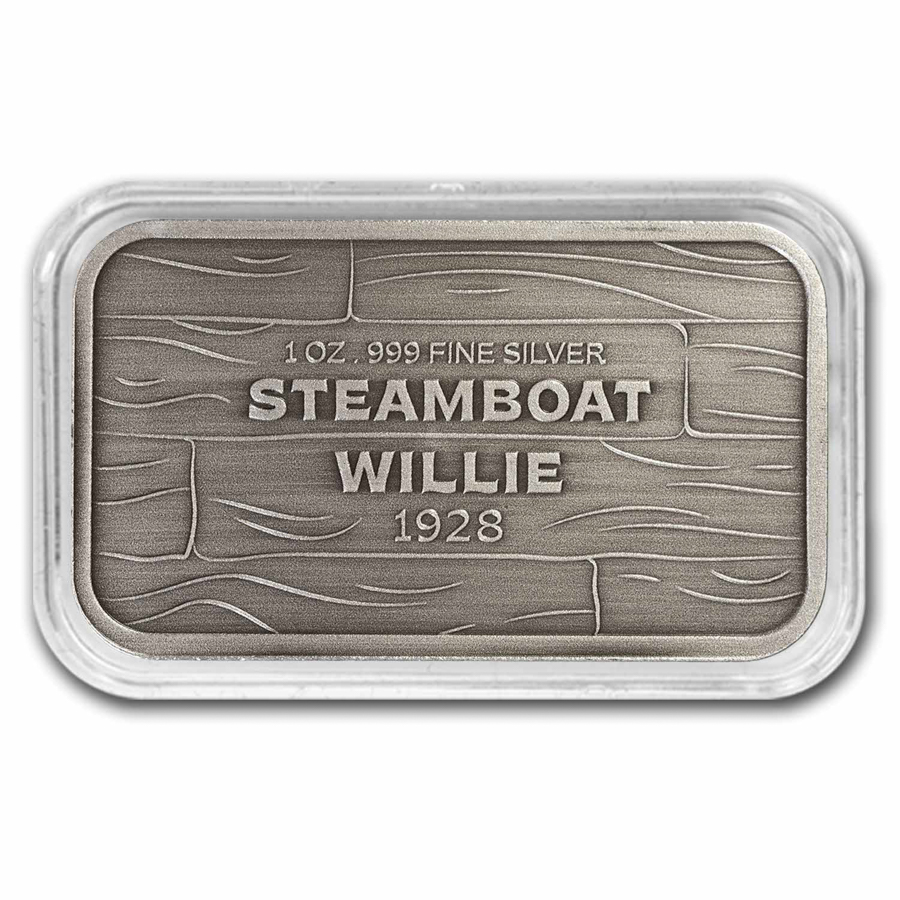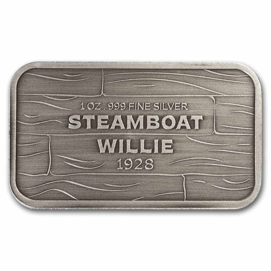 Build your silver holdings in a classic and historic design featuring an iconic moment in animation history. Add these antiqued 1 oz Silver Steamboat Willie bars to your cart today!