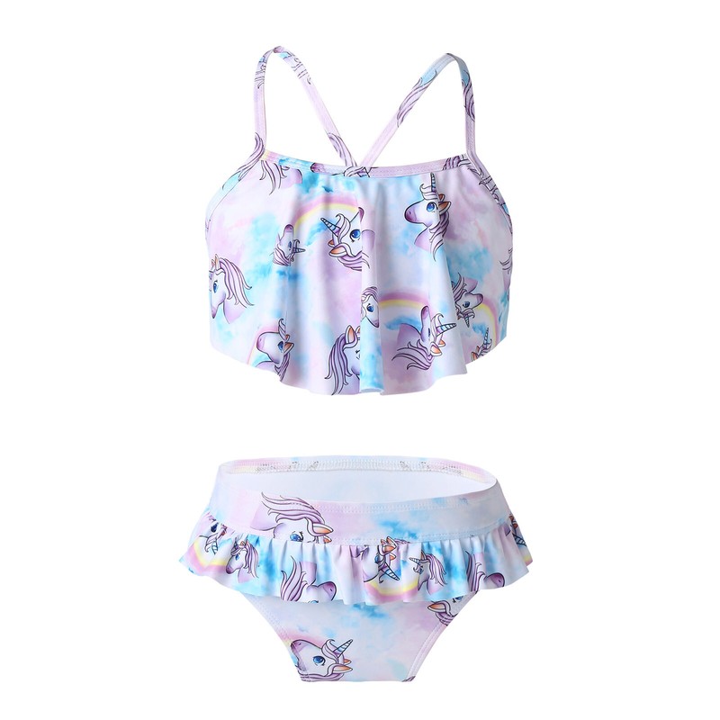 2Pcs Girls Spaghetti Straps Criss Cross at Rear Ruffle Hem Tube Top with Bottom Set Swimwear Suits.