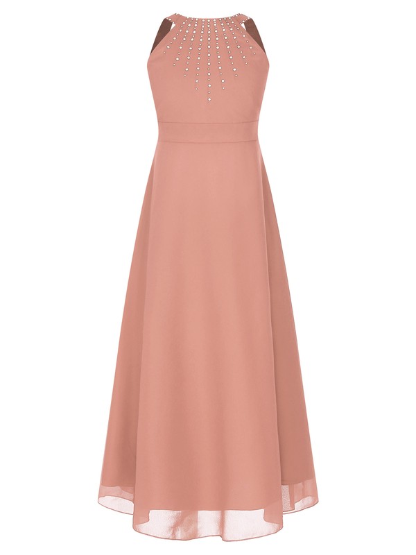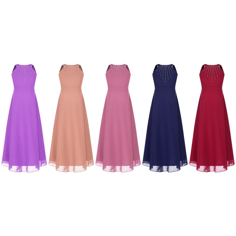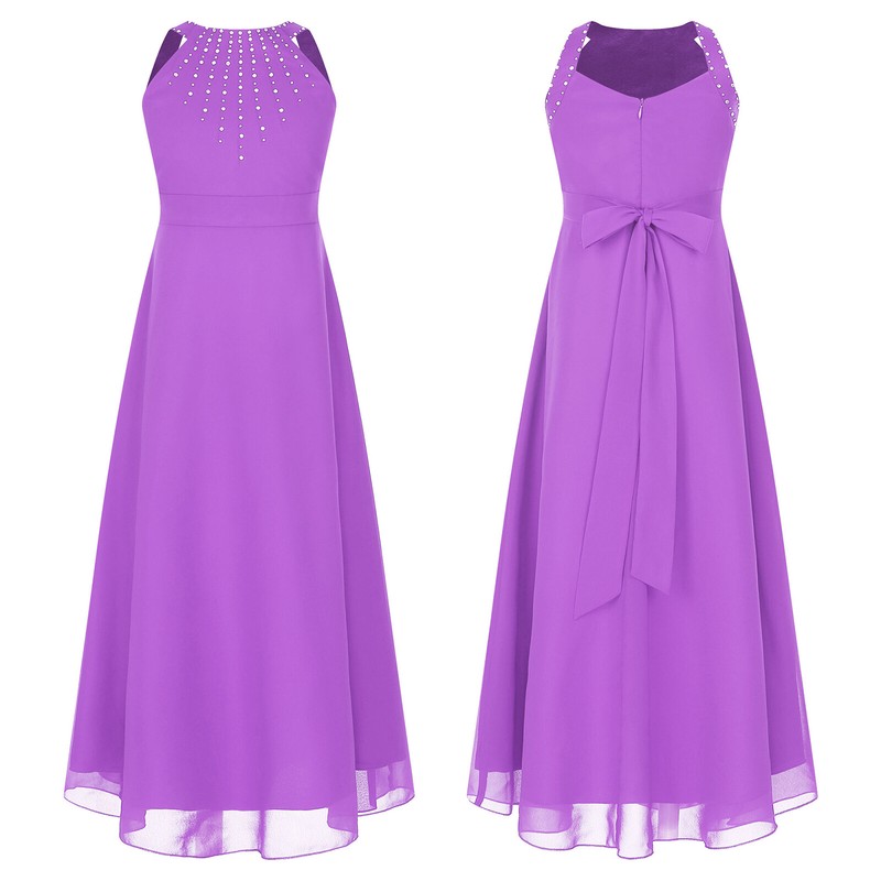 Designed with round neck, sleeveless, shiny rhinestones, high waist, smooth lining, A-line, back zipper closure with the sash.