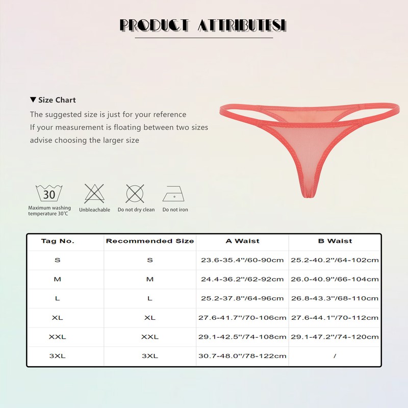 Designed with elastic spaghetti waistband, low rise, mesh crotch and T-back. Different types and colors for you to choose from.