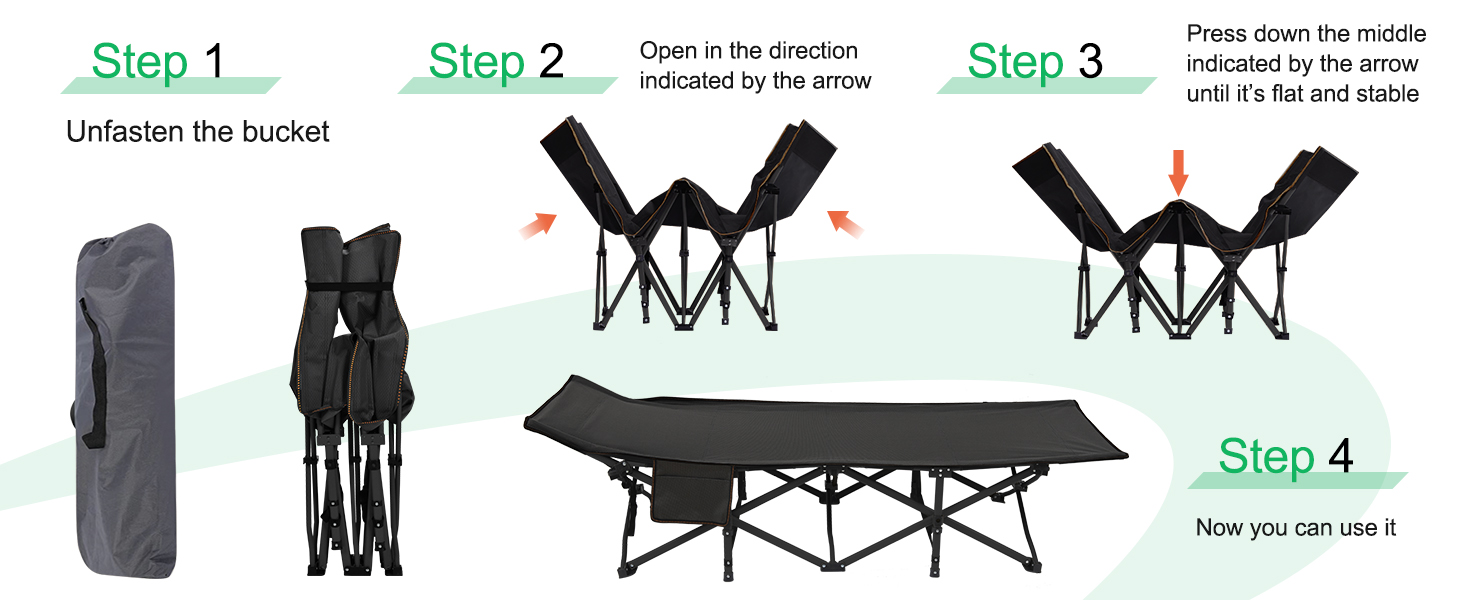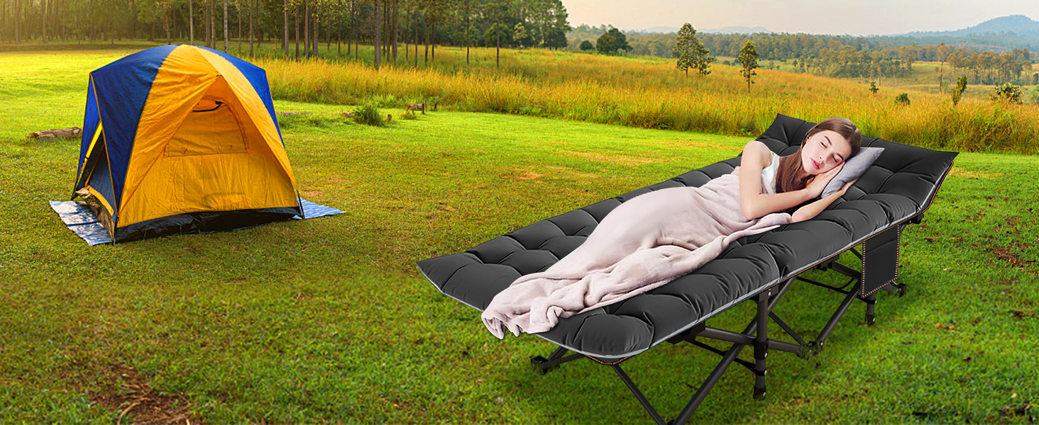 Portable Size: The heavy duty wide sleeping cot for adults measures 75"x28"x14" when open, folded dimension is 39"x8". A carry bag with a handle is available. Easy to take it out for camping.