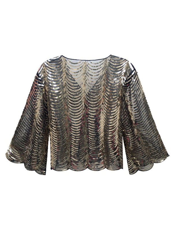Designed with v neck, flare sleeve, open front with a hidden closure, shiny sequin and waved trims, the cardigan is perfect for party.