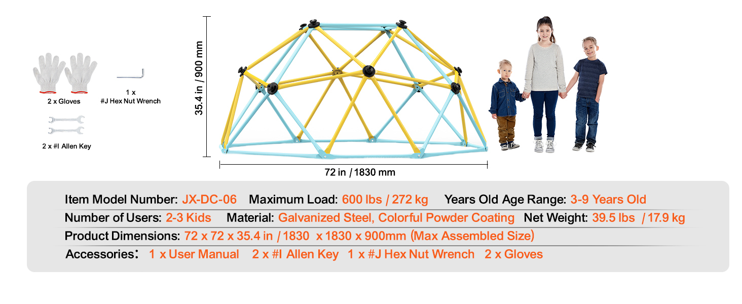 Multiplayer Fun: Our 6FT geometric climbing dome is perfect for children aged 3-9 and designed for large families. It can accommodate up to 2-3 kids playing at once, creating a family playground. The size is ideal for both indoor and outdoor use.