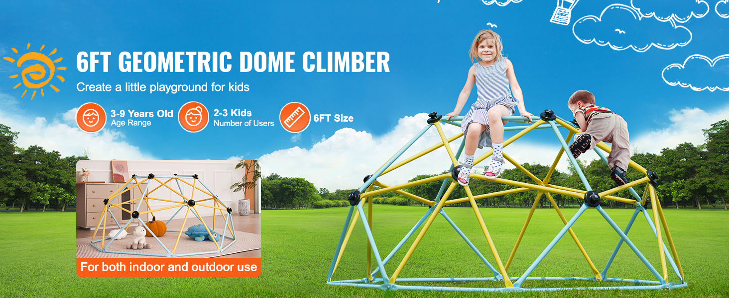 Our 6FT geometric climbing dome allows 2-3 children aged 3-9 to play simultaneously, creating a family fun zone at home. Perfect for home play on days when going out isn't possible. The size is ideal for both indoor and outdoor use.