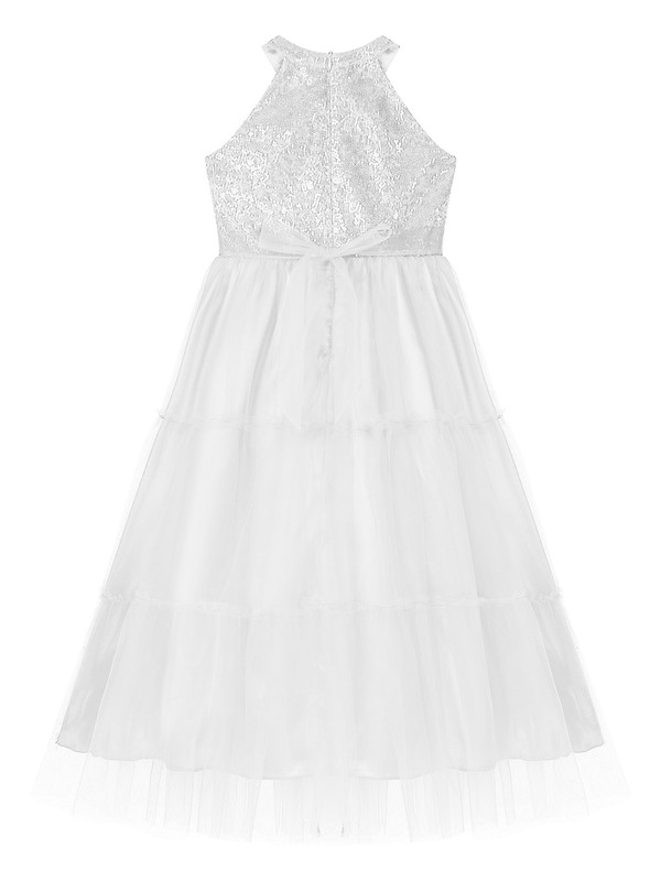Designed with sequined bodice and tiered tulle hem, halter neck, sleeveless, high waist, puff tulle hem, back zipper closure with sash.