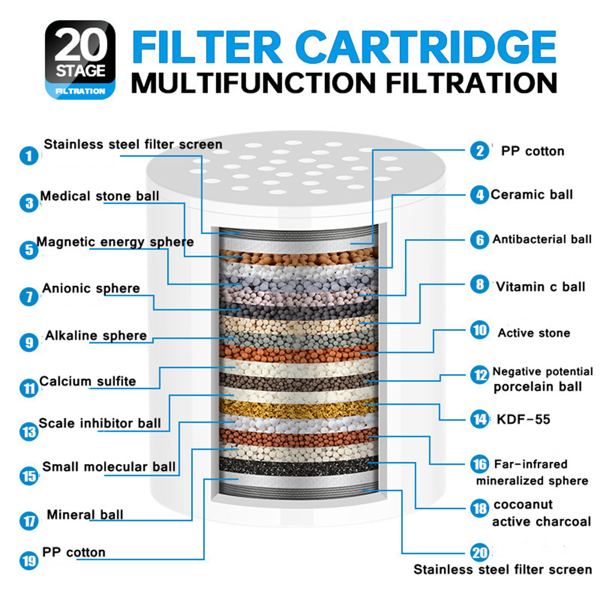 20-Stage Filtration: KDF 55, Alkaline Ceramic Balls, Activated carbon, Calcium Sulfite and other filtering materials ensures best effect of water quality purification. 20 Stages filter materials can effectively reduce chlorine, heavy metals, rust, sand and other sediments.