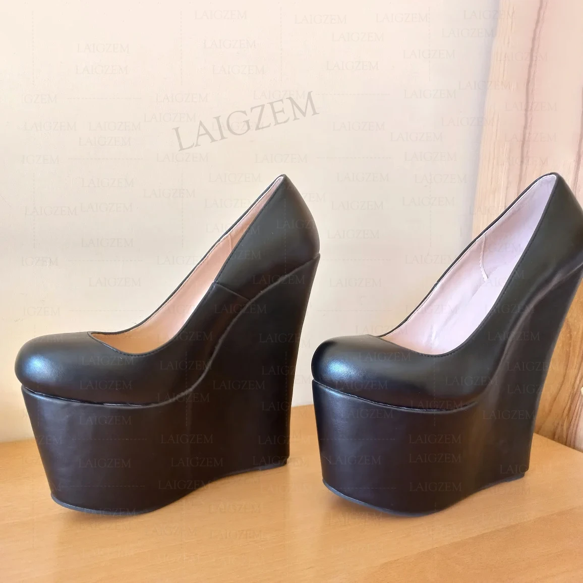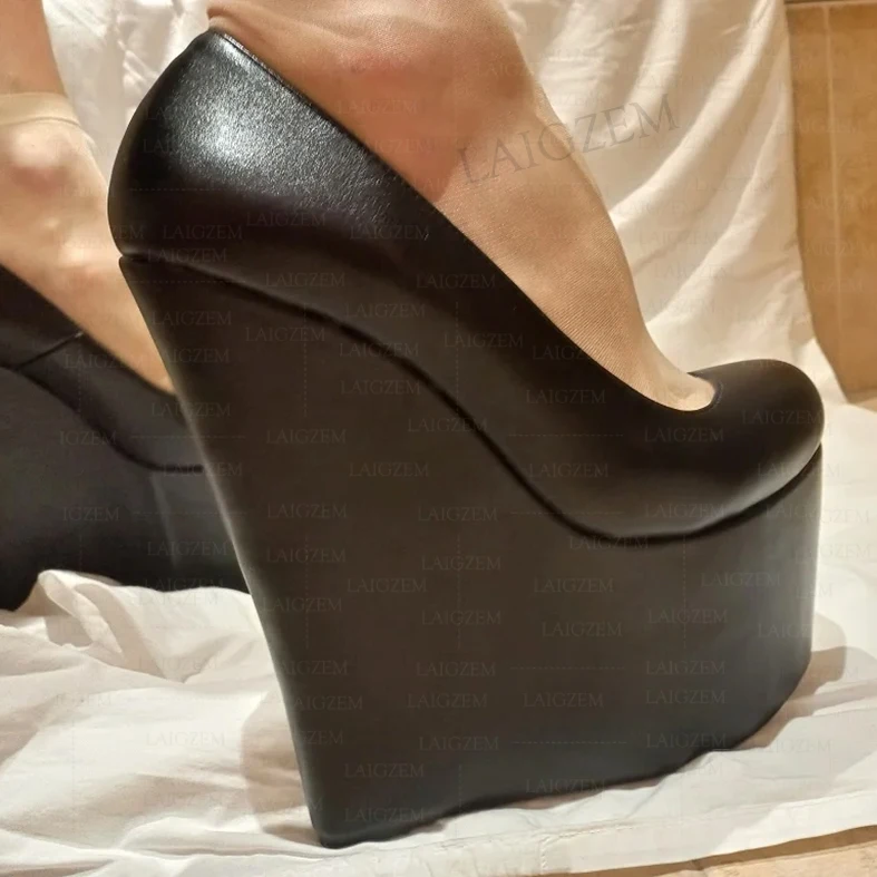 SEIIHEM Women Pumps 20CM High Heels Wedges Round Toe Mules Party Faux Leather Ladies Club Shoes Woman Large Size 38 41 42 44 48
