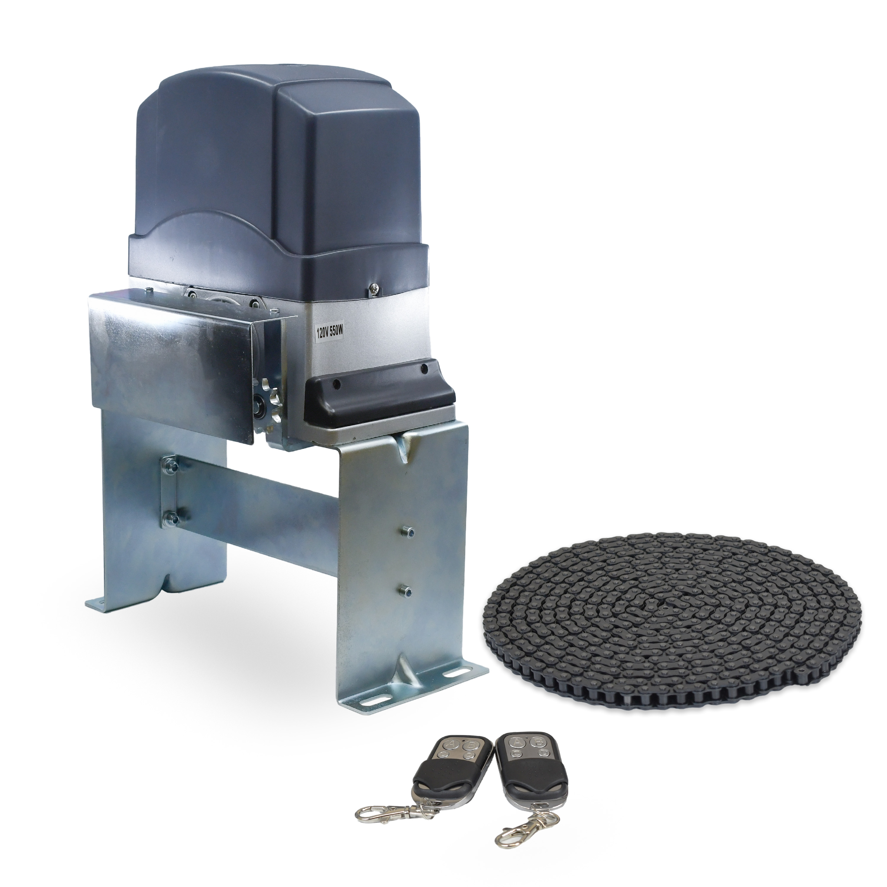 ALEKO chain driven sliding gate opener provides exceptional starting torque and continuous operation making it ideal for most applications. Single Phase Motor. Magnetic limit switches for easy adjustments. For your safety, this model will stop and reverse if encounters an obstruction on closing or opening. Built in adjustable auto-close future. Manual key release design for emergency purposes. Specification: Opens gates weighing up to 3400 lbs or 52 ft in length Easy to install Built-in Radio receiver User programmable and user erasable remote codes RF hopping code technology prevents your remote code being accessible to others Built in adjustable auto-close (0, 30, 60, 90 seconds) Stop/Reverse in case of obstruction during gate opening/closing Built in max. 90 seconds Motor running time (MRT) for multiple safety Manual key release design for emergency purposes Pedestrian mode / Single Phase Motor Included: Gate Opener unit, Chain 20 feet (if the capacity exceeds more than 20 ft just purchase an extra chain), Mounting Metal Base, Two Remotes, Mounting hardware, Manual with step by step instructions TECHNICAL SPECIFICATIONS:
