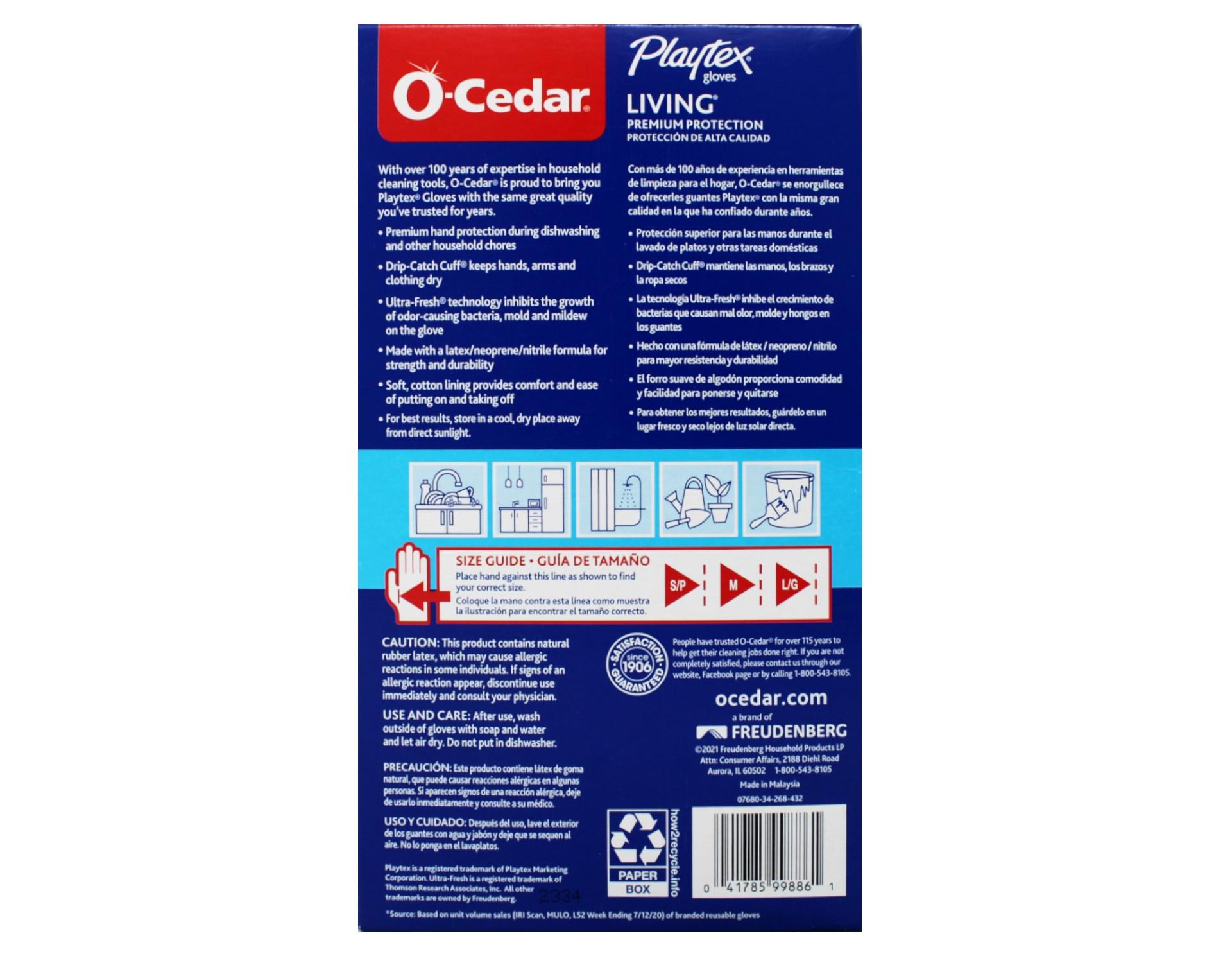 Worry-free cleaning at your fingertips with the #1 reusable household gloves*. Our Playtex? Living? Gloves are durable, reusable, and provide the ultimate protection from water and harmful household chemicals. Designed with a Drip-Catch Cuff?, the extra long pair is specially designed to prevent back drip and splashes on clothing and skin. They’re complete with Ultra-Fresh? technology to inhibit bacteria growth and lingering odors on the glove. • Extra long Drip-Catch Cuff? keeps hands, arms and clothing dry • Triple-layer protection keeps hands safe • Ultra-Fresh® technology inhibits the growth of odor-causing bacteria including mold and mildew on the glove • Textured safety-grip at palm and fingertips for secure handling of wet or fragile items • Soft, cotton lining provides comfort and ease taking on and off • Perfect flex design for excellent fit, feel and comfort • Made with latex, neoprene and nitrile formula for strength and durability USE & CARE After use, wash outside of gloves with soap and water. Let air dry. Do not wash in dishwasher. For best results, store in a cool, dry place away from direct sunlight. Gloves are available in Small, Medium and Large.